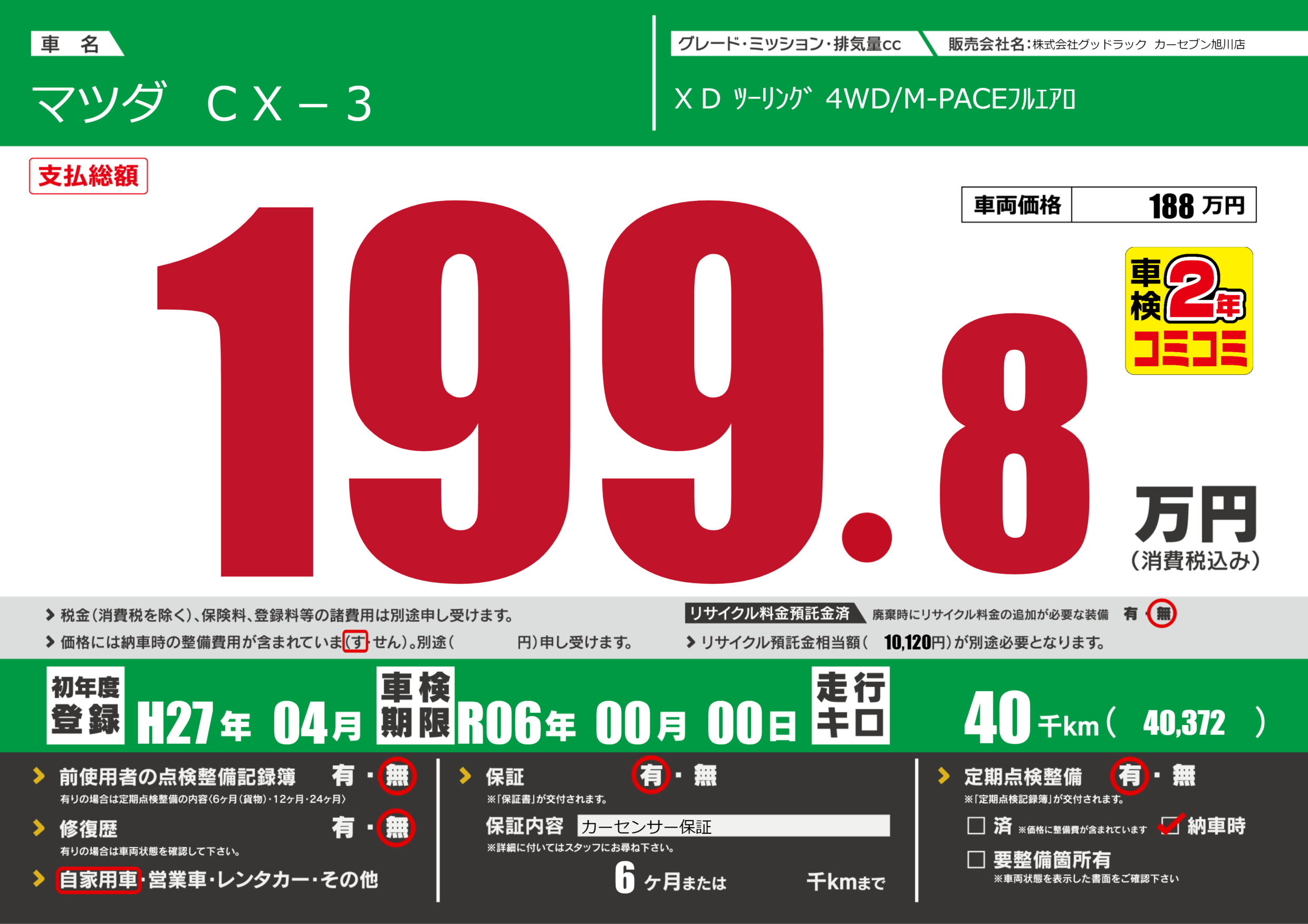 | 車名 | マツダ CX-3 | グレード ミッション 排気量 |