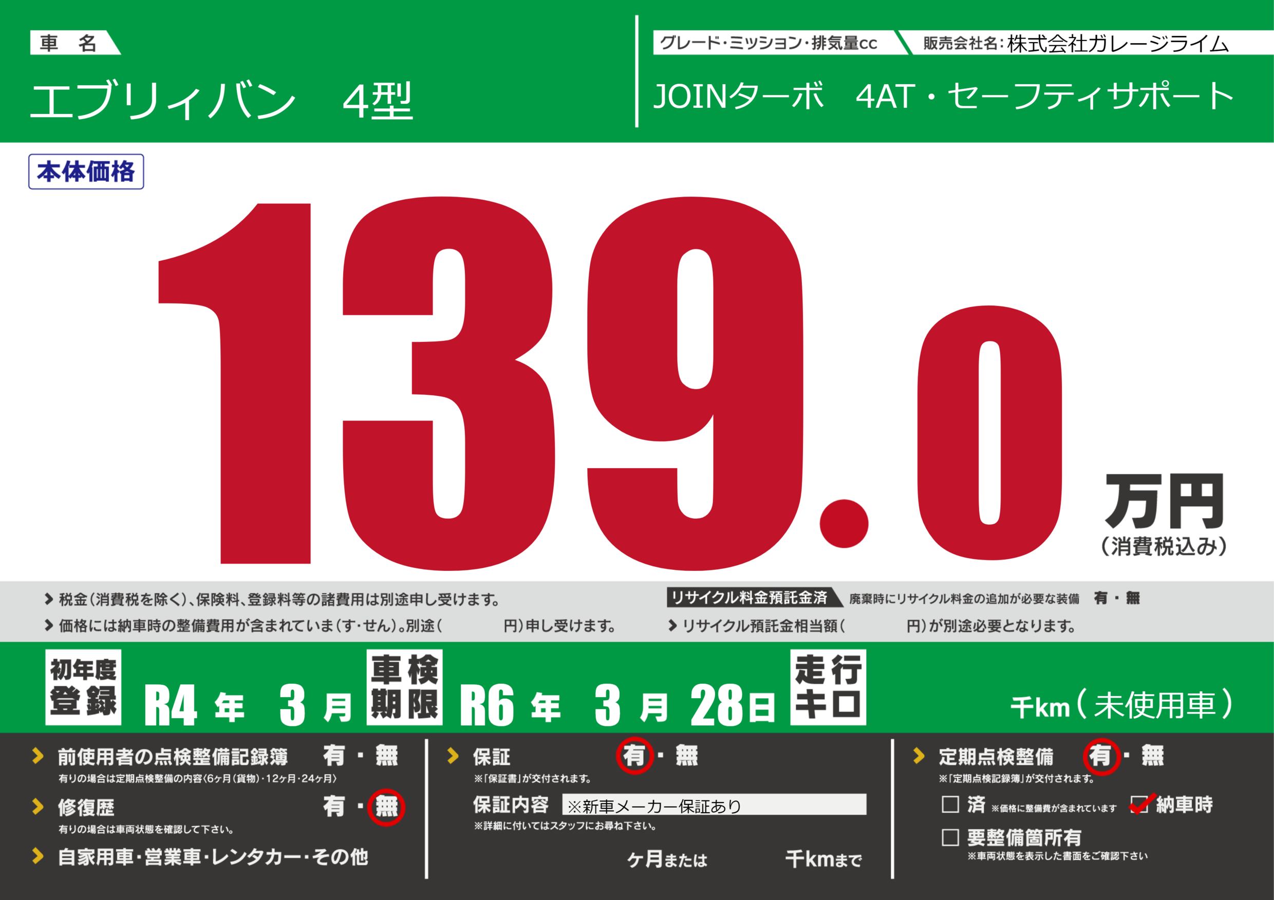 | 車名 | エブリィバン 4型 | グレード ミッション 排気量 |