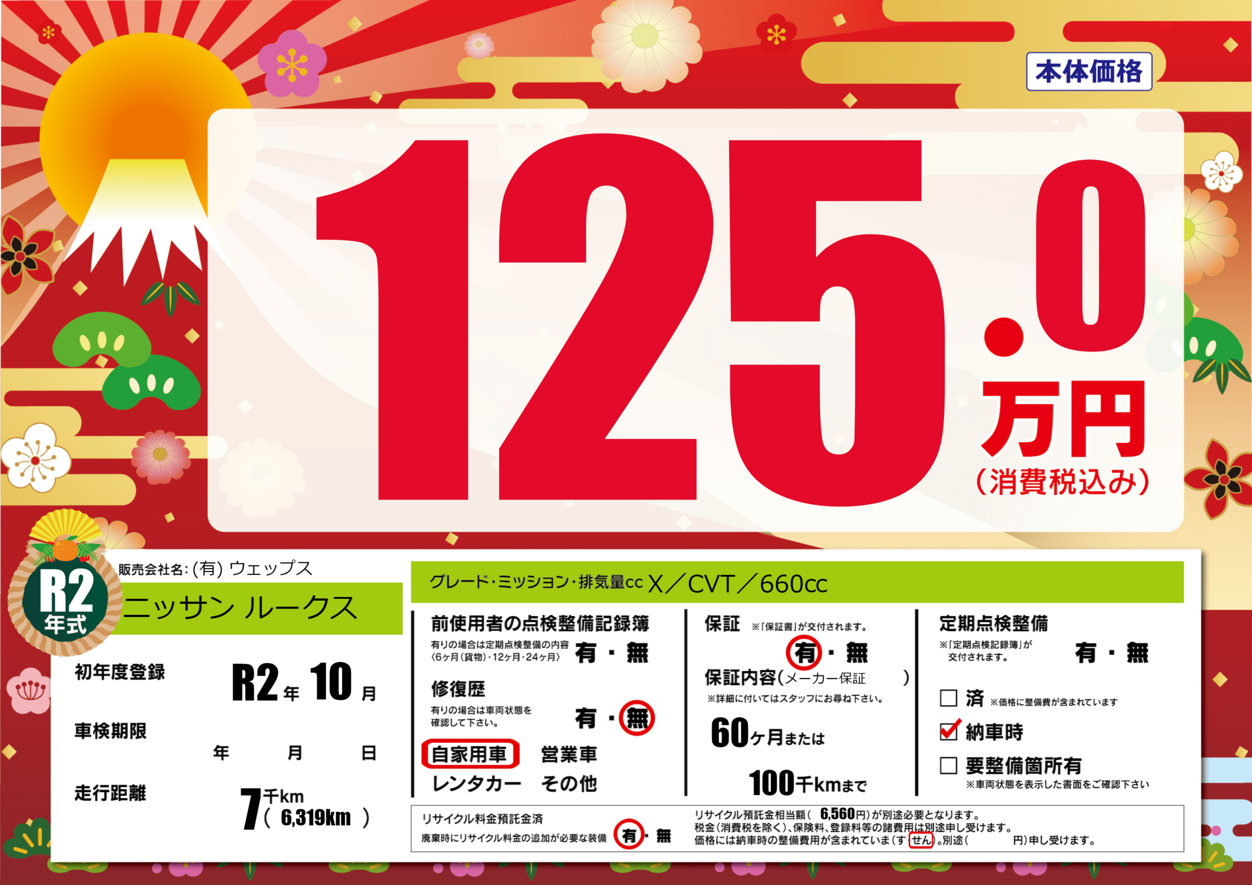 | 車名 | ニッサン ルークス | グレード ミッション 排気量 |