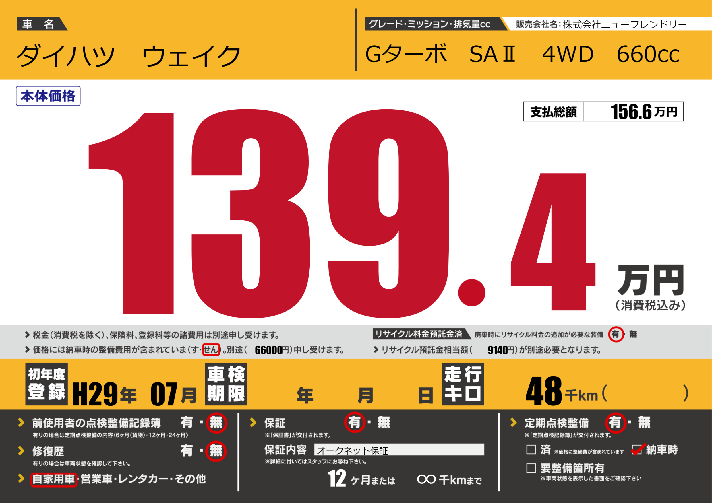 | 定期点検整備 | 定期点検整備あり 納車時あり | ||