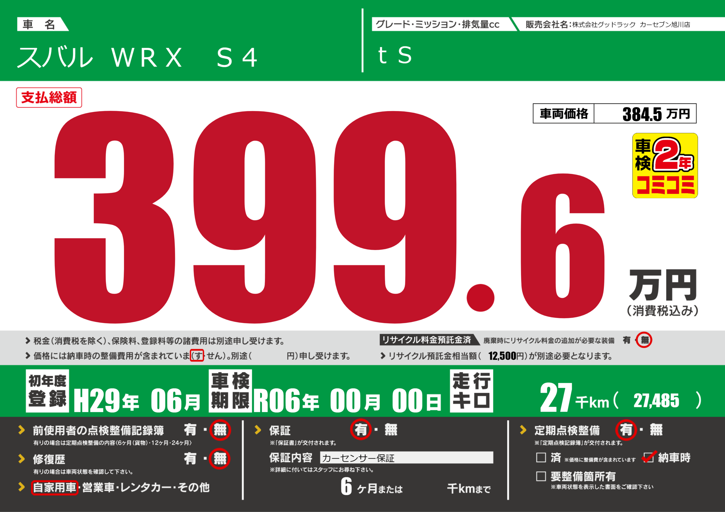 | 車名 | スバル WRX S4 | グレード ミッション 排気量 |