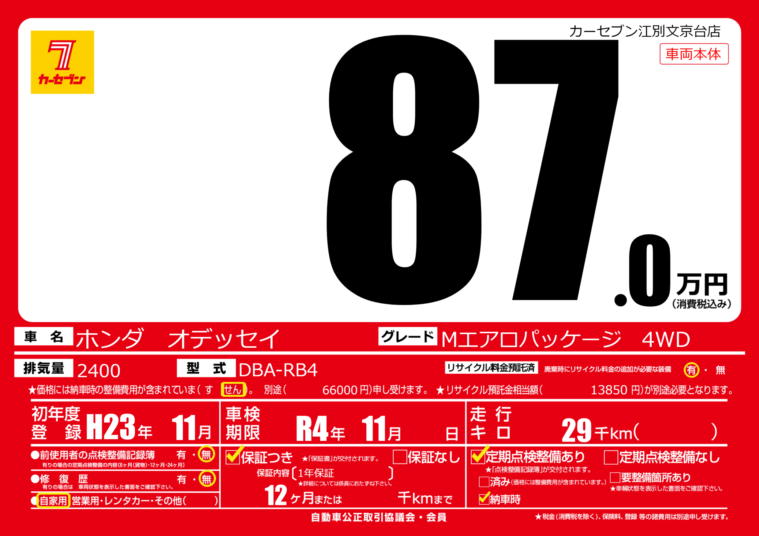 | 車名 | ホンダ オデッセイ | グレード ミッション 排気量 |