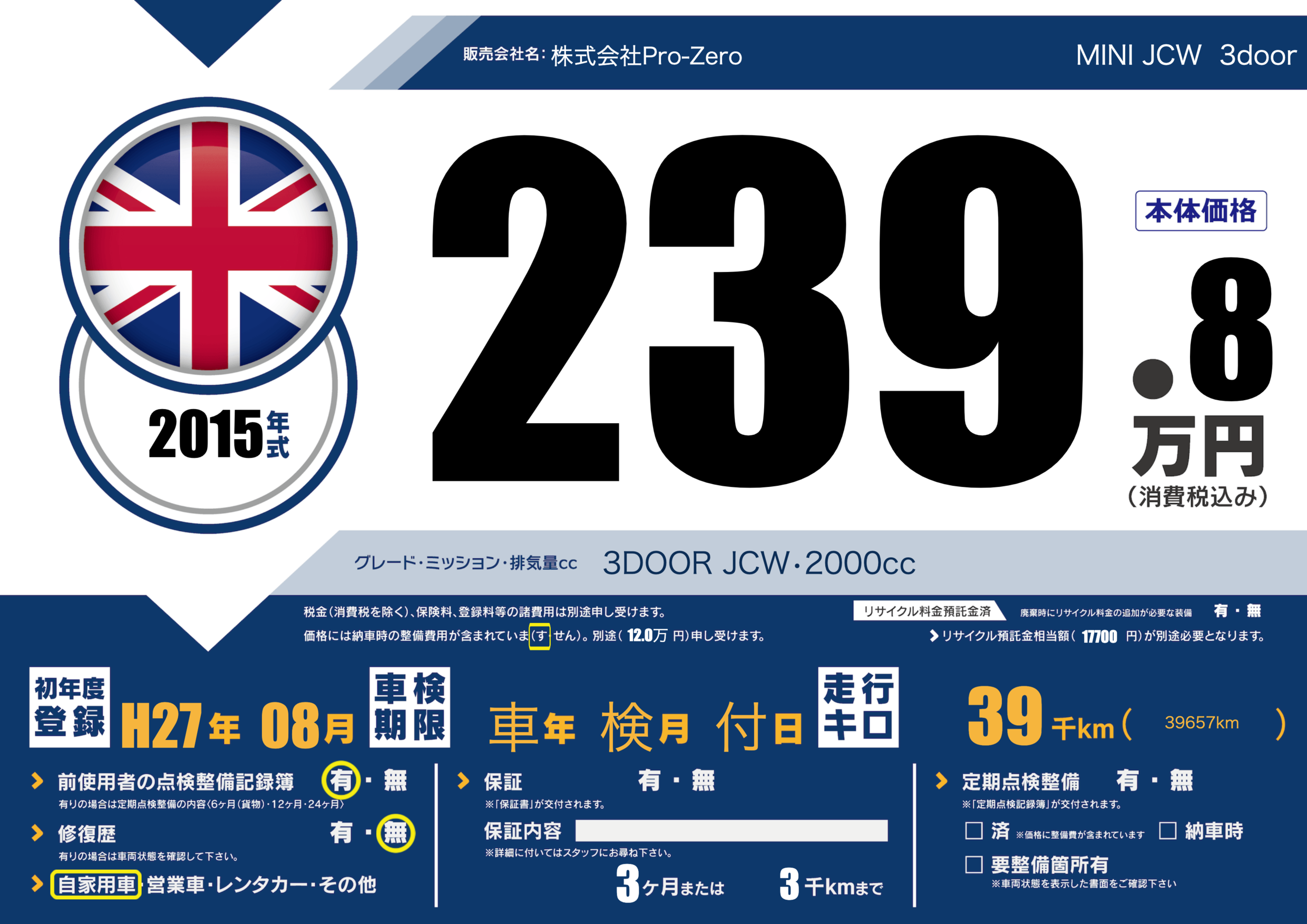 | 車名 | MINI JCW 3door | グレード ミッション 排気量 |