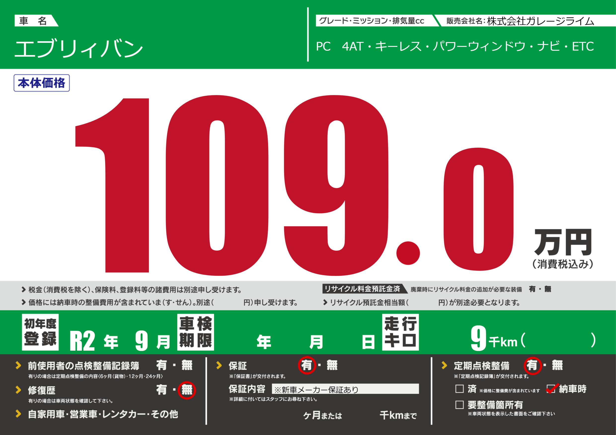 | 定期点検整備 | 定期点検整備あり 納車時あり | ||