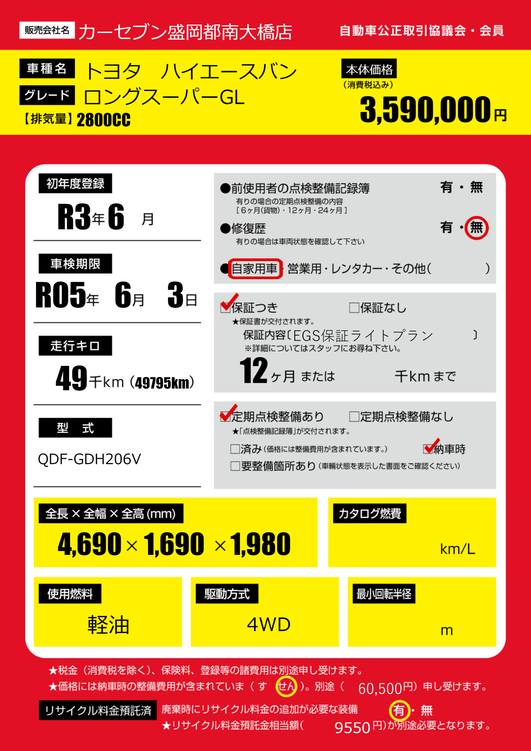 | 車名 | トヨタ ハイエースバン | グレード ミッション 排気量 |