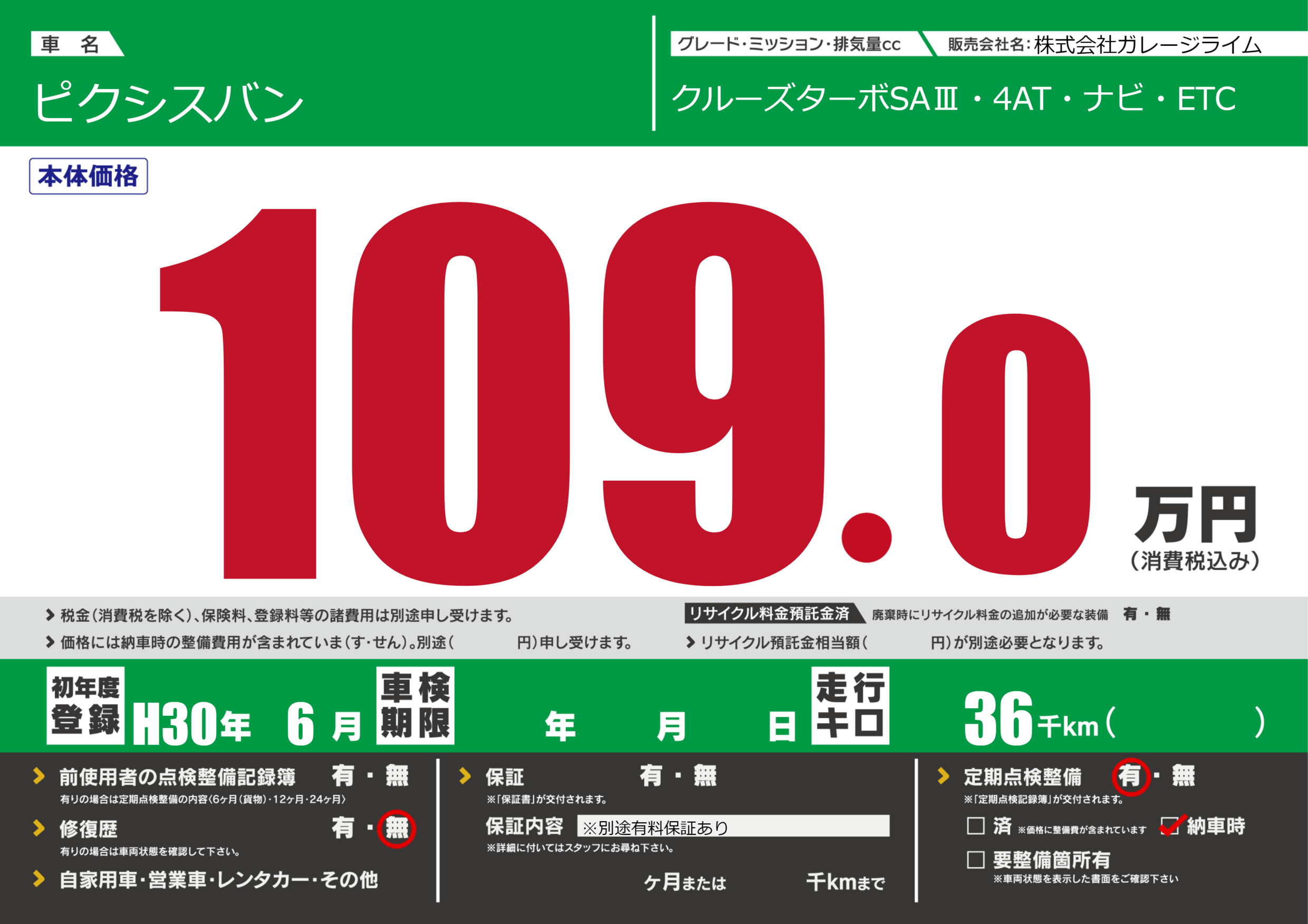 | 定期点検整備 | 定期点検整備あり 納車時あり | ||