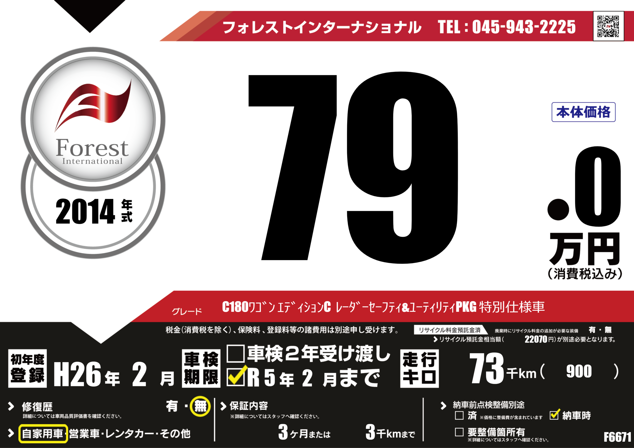 | 走行キロ | 7.3万km | 初年度登録 | H26年2月 |