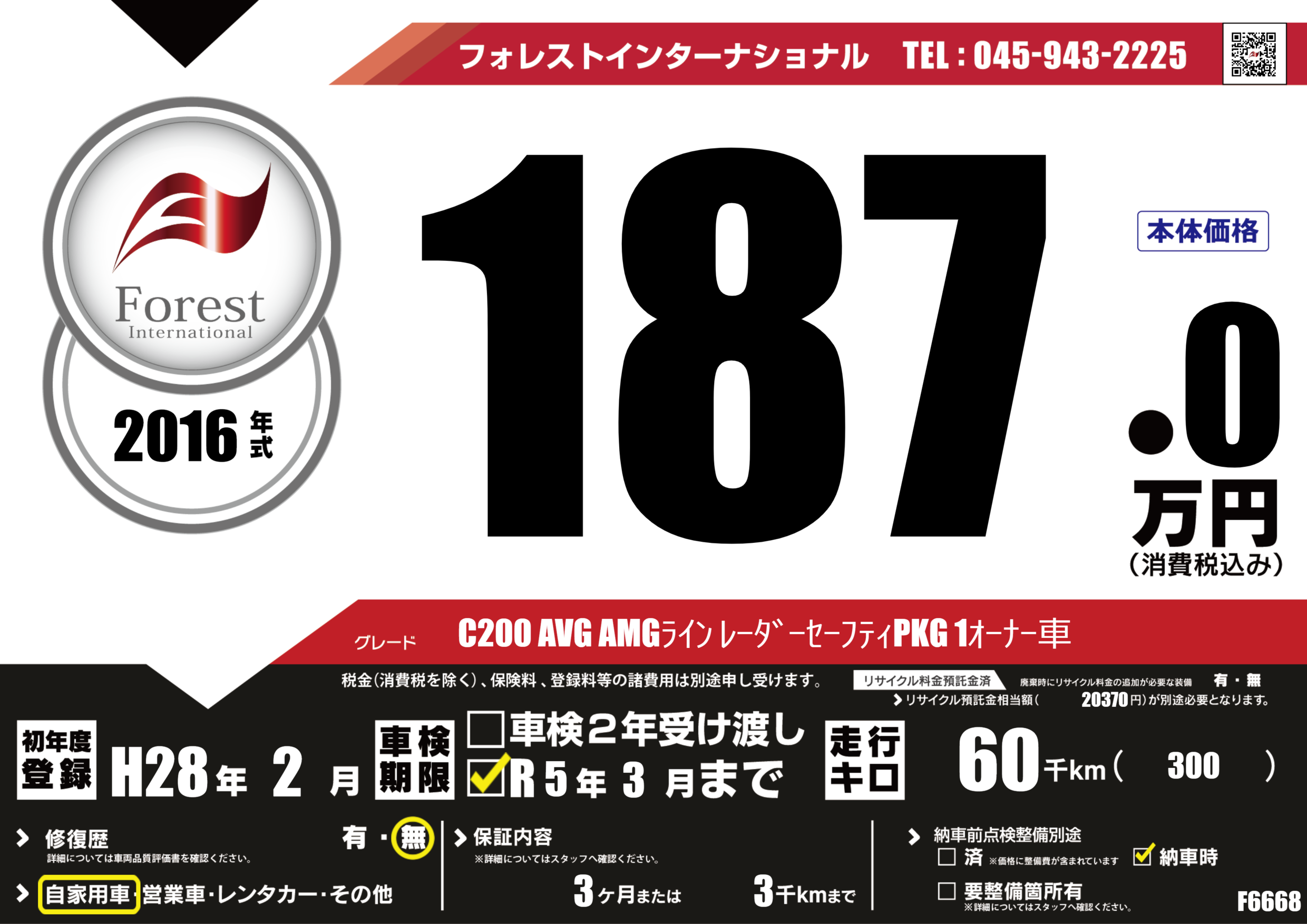 | 走行キロ | 6万km | 初年度登録 | H28年2月 |