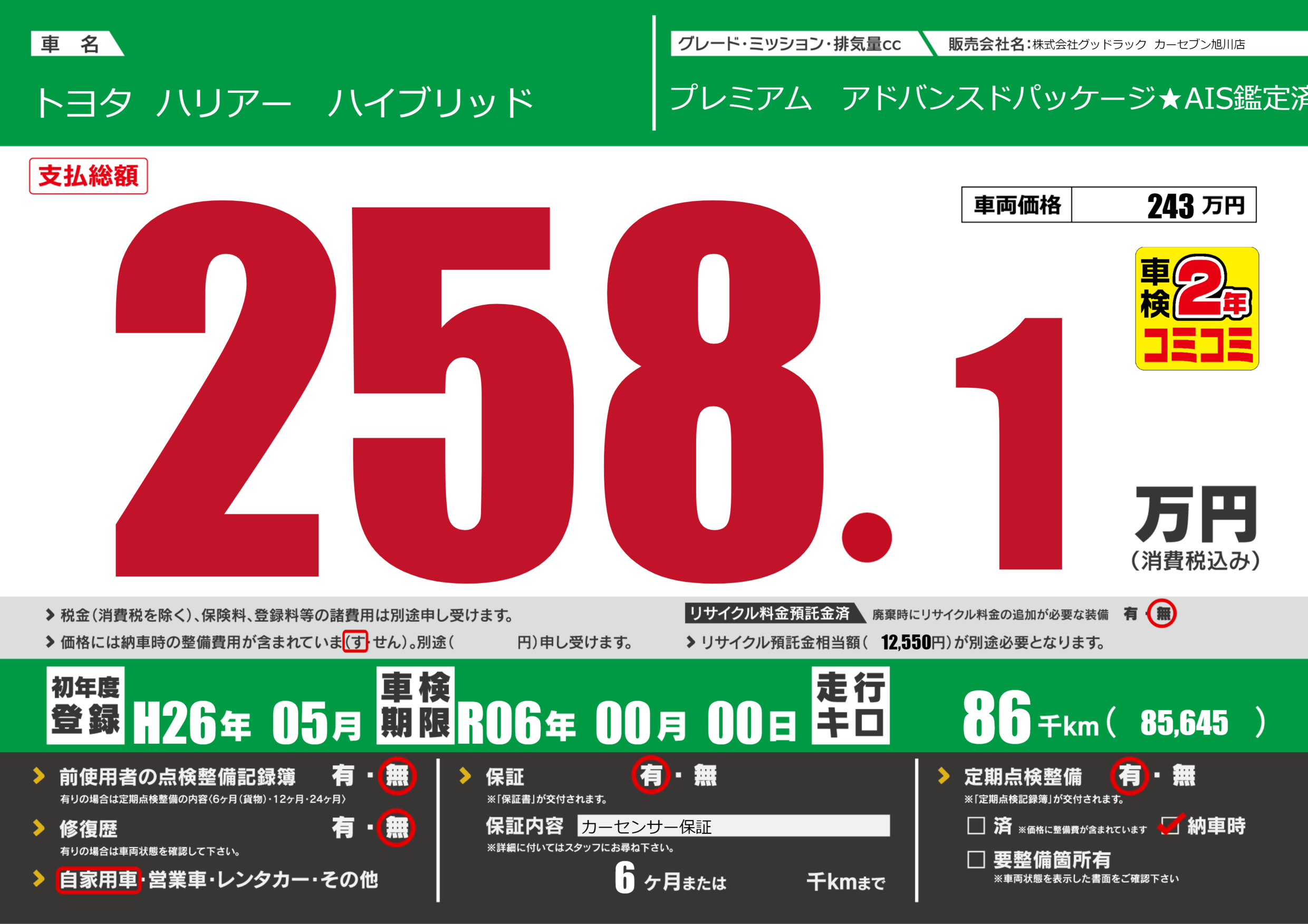 | 車名 | トヨタ ハリアー ハイブリッド | グレード ミッション 排気量 |