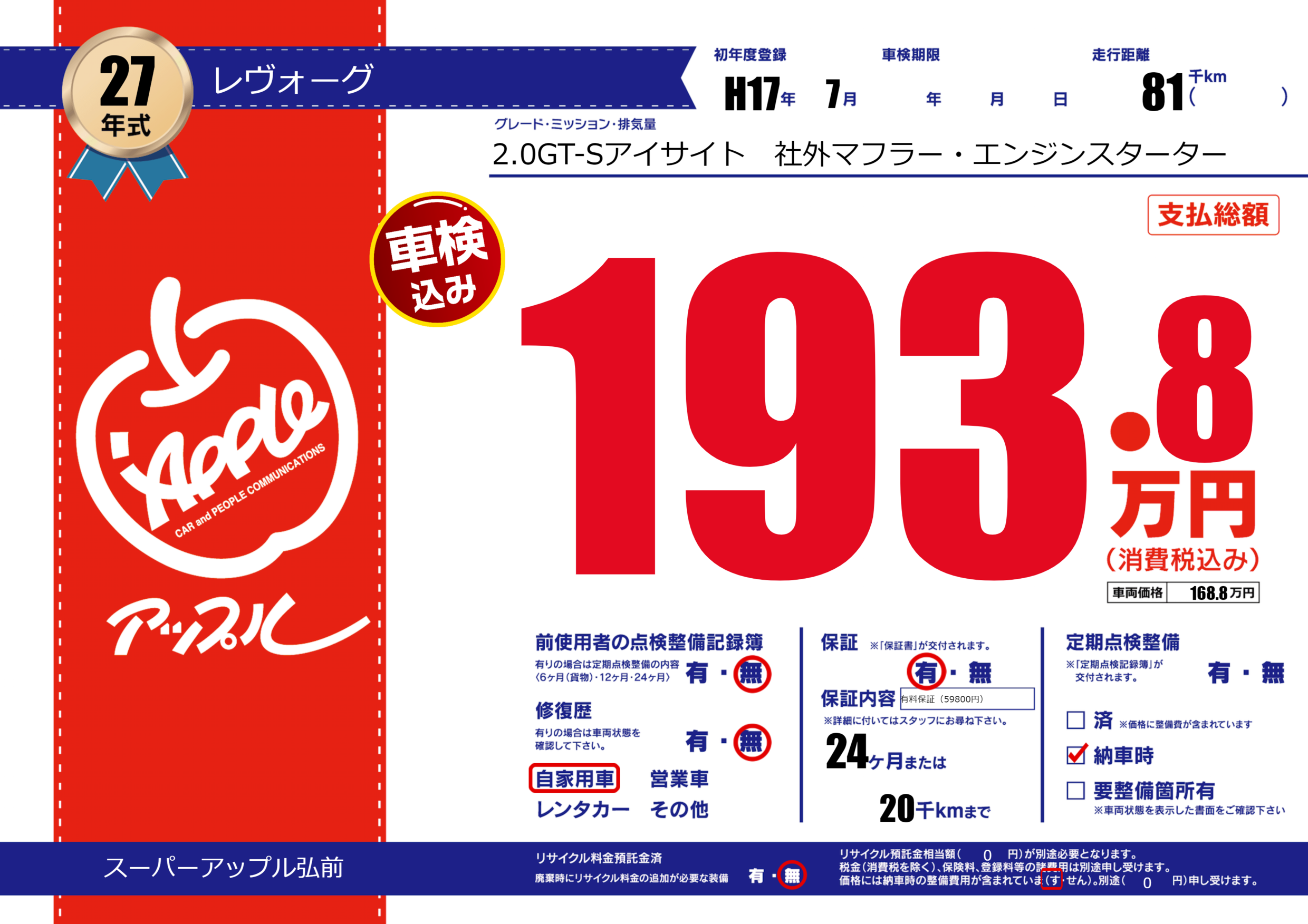 | 車名 | レヴォーグ | グレード ミッション 排気量 |