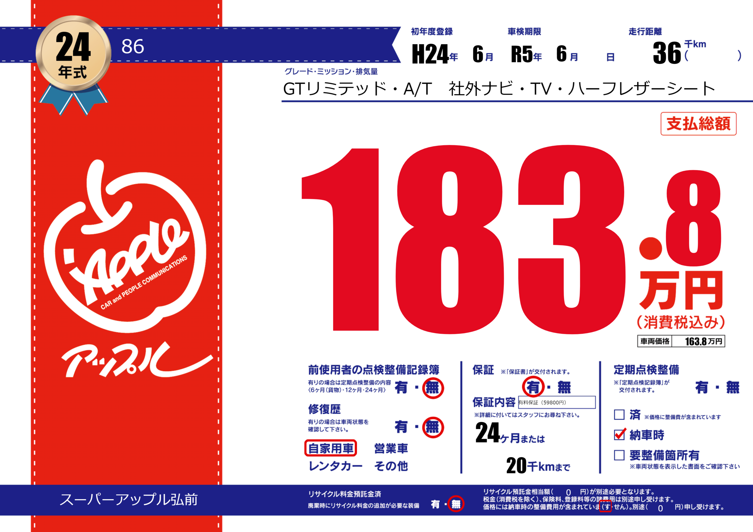 | 走行キロ | 3.6万km | 初年度登録 | H24年6月 |