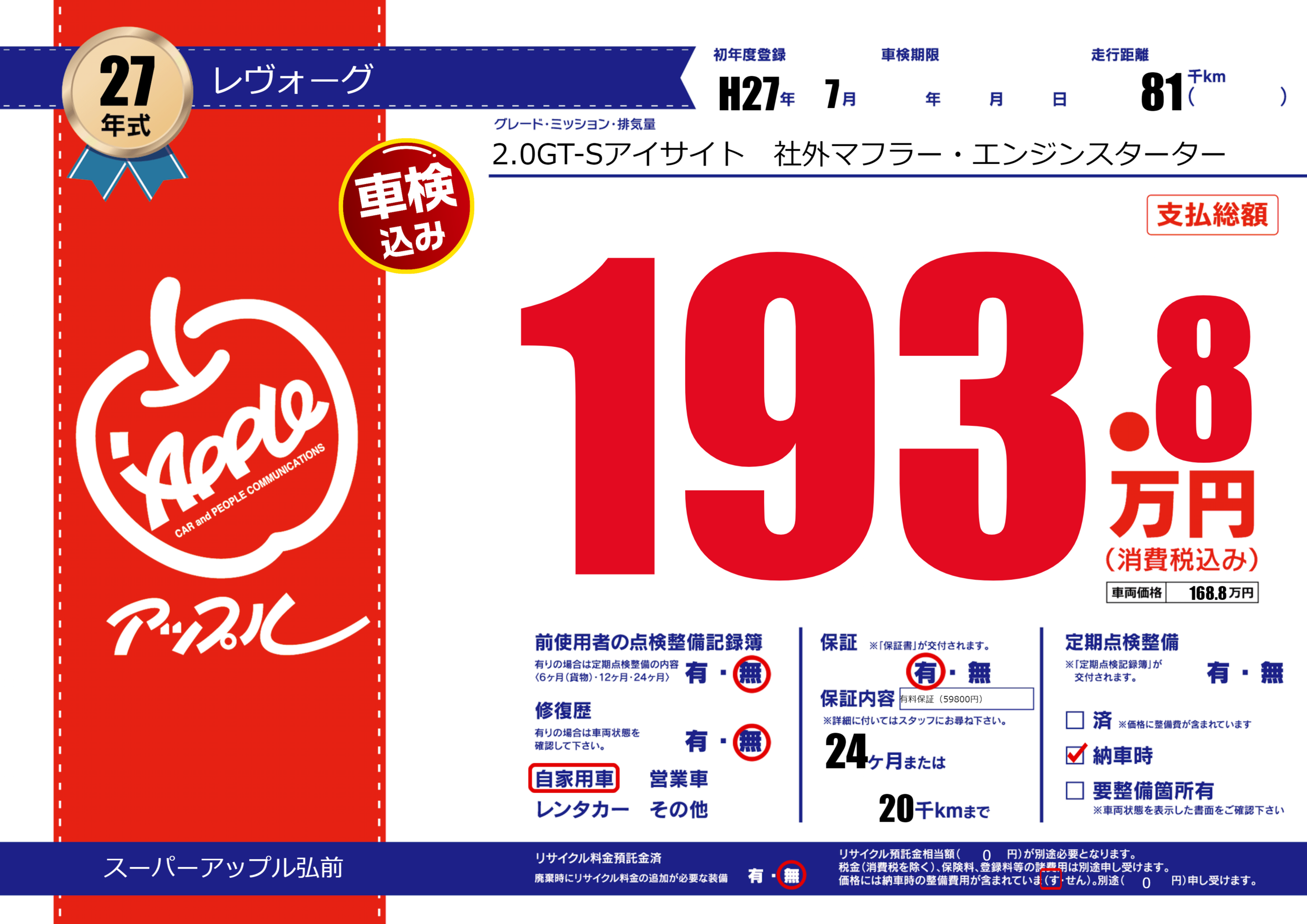 | 車名 | レヴォーグ | グレード ミッション 排気量 |
