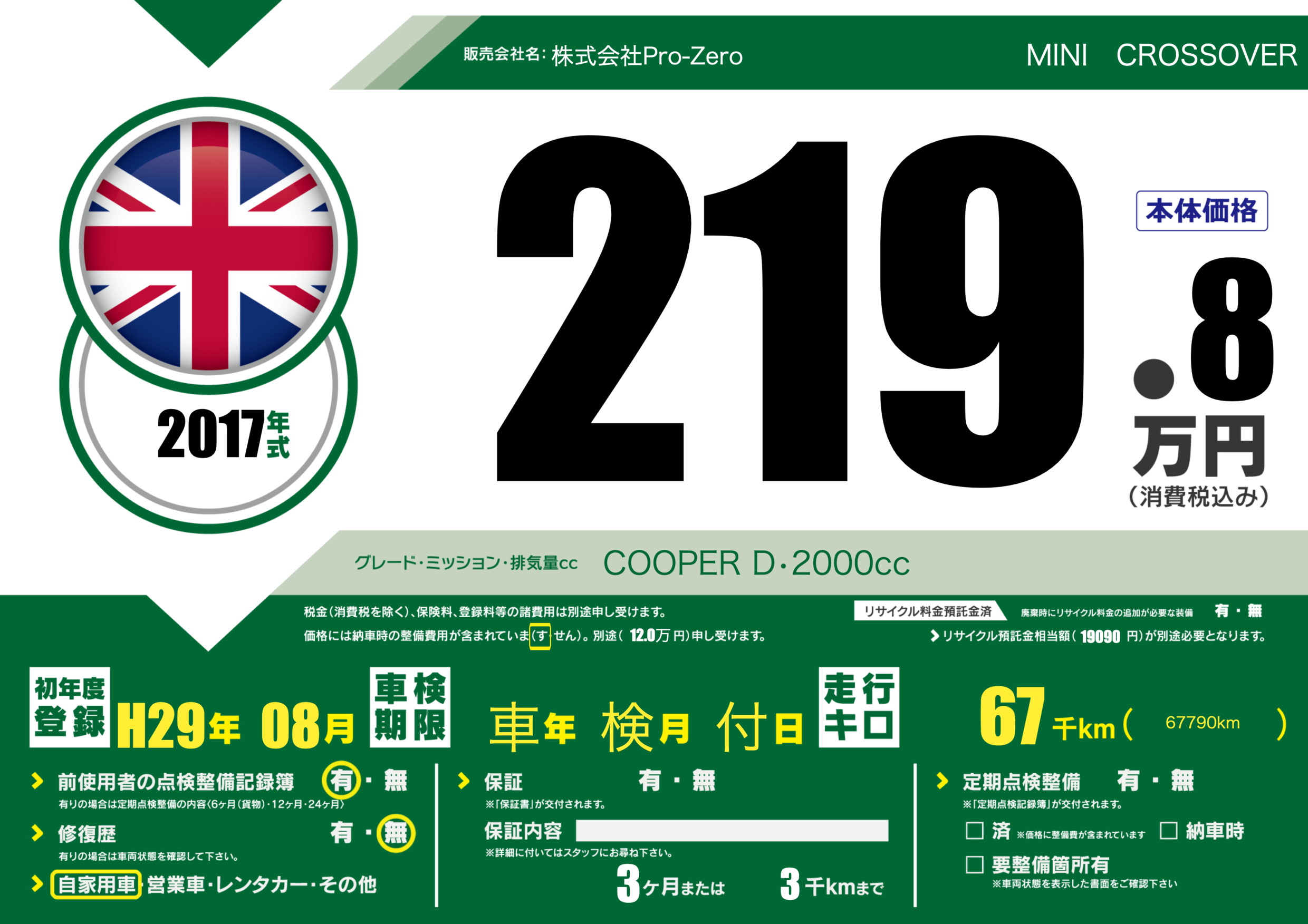 | 車名 | MINI CROSSOVER | グレード ミッション 排気量 |