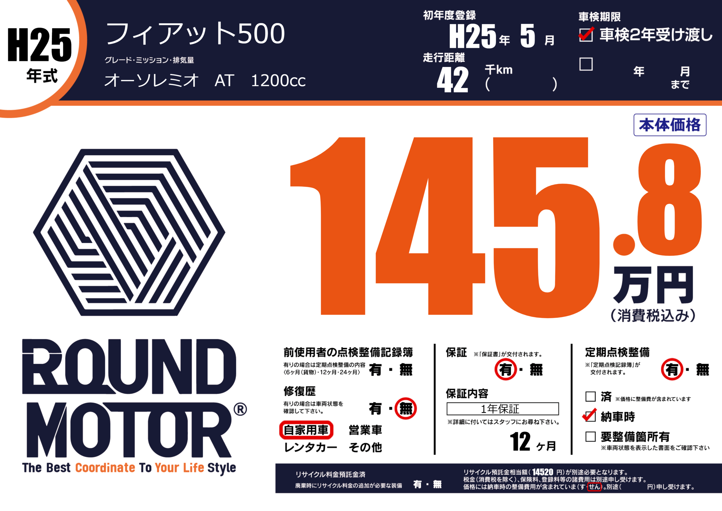 | 車名 | フィアット500 | グレード ミッション 排気量 |