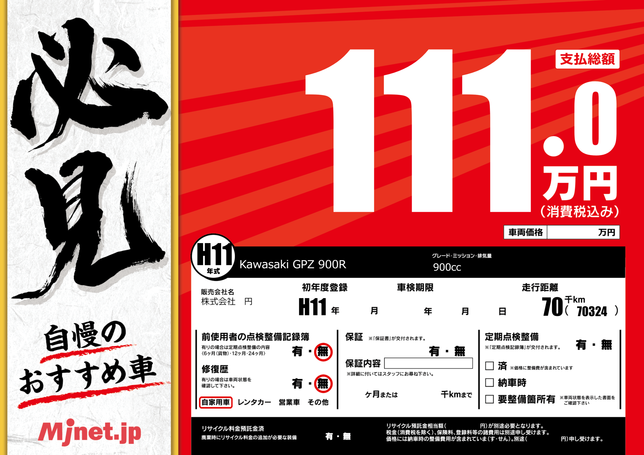 | 車名 | Kawasaki GPZ 900R | グレード ミッション 排気量 |