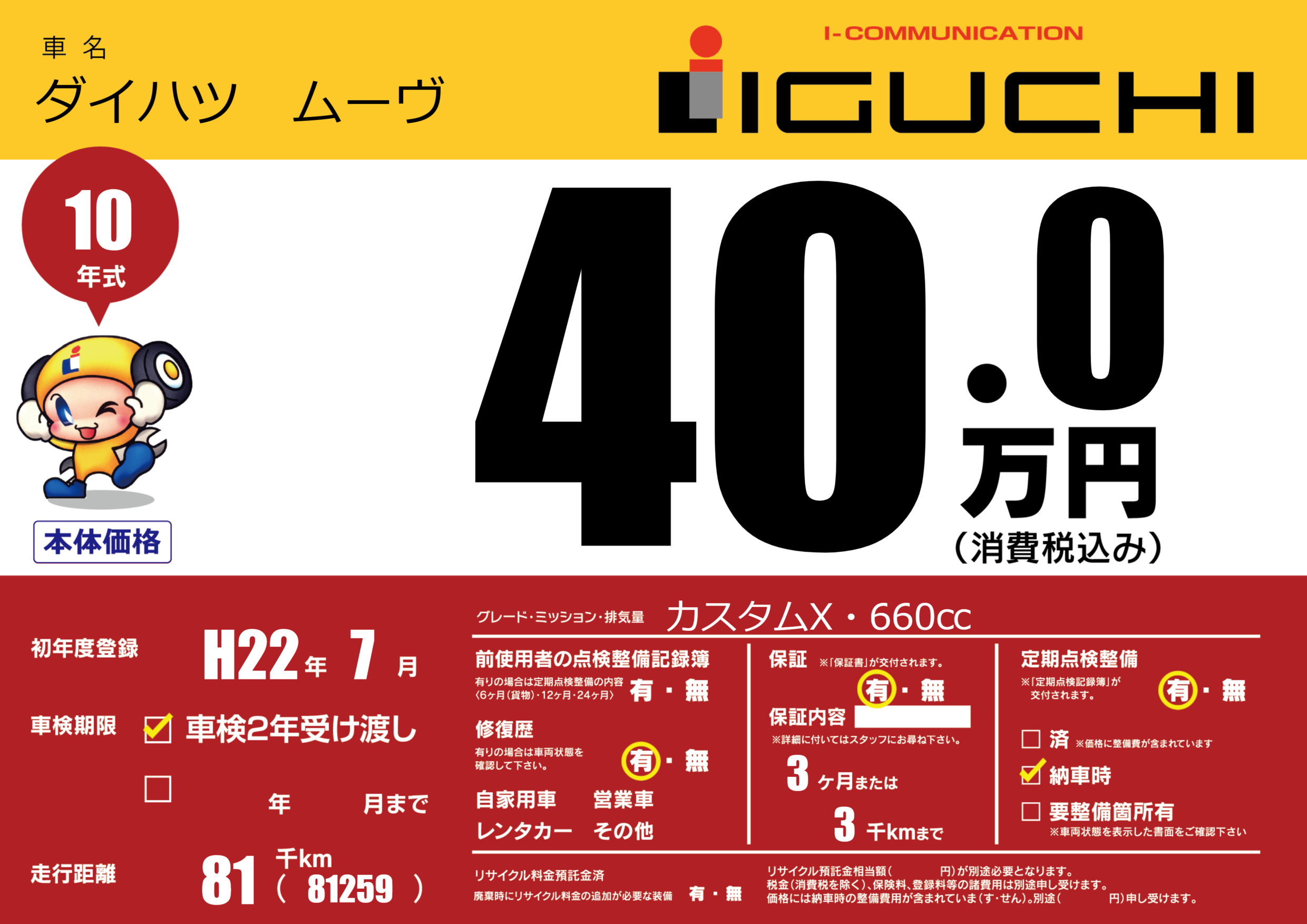 | 車名 | ダイハツ ムーヴ | グレード ミッション 排気量 |