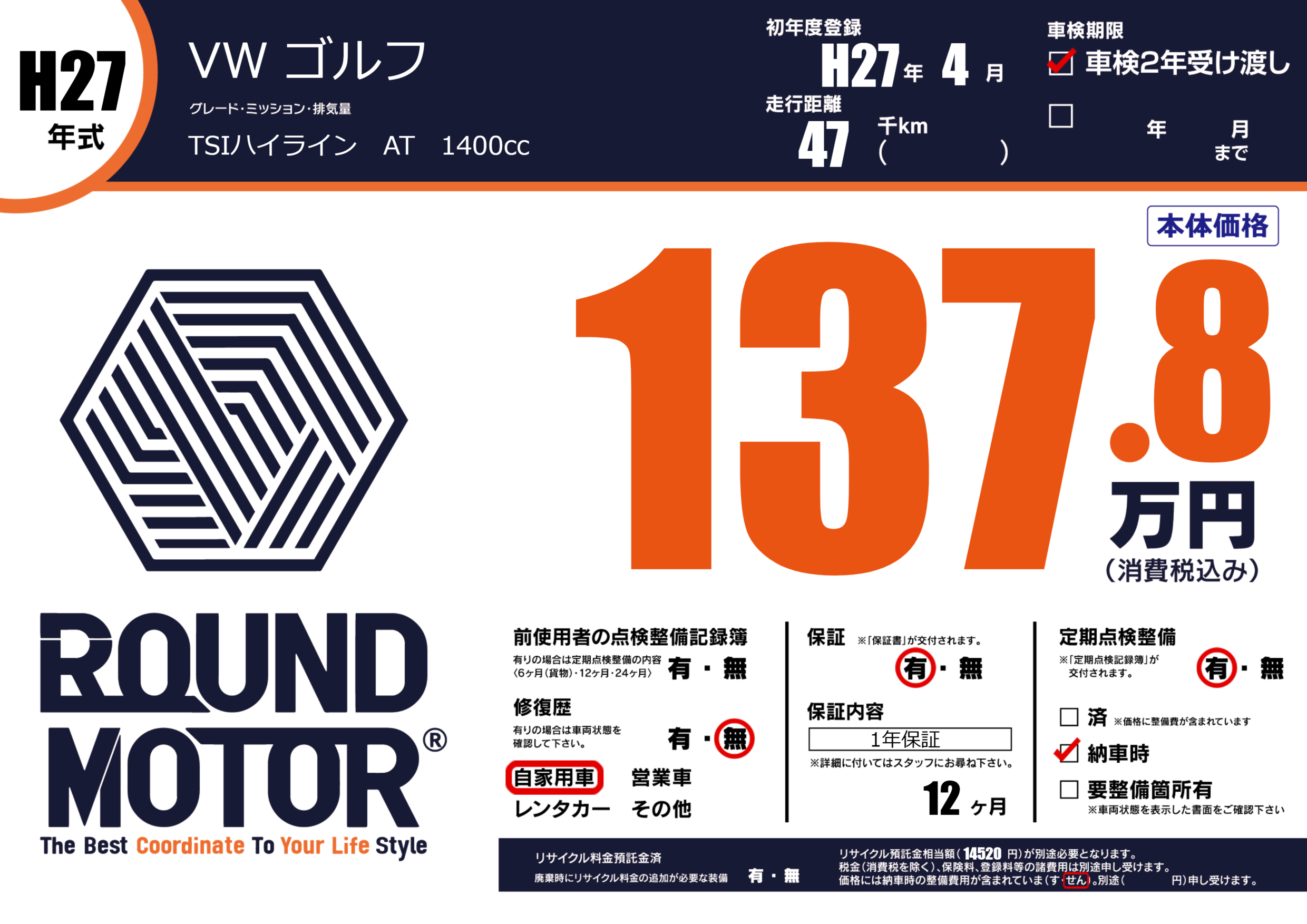 | 車名 | VW ゴルフ | グレード ミッション 排気量 |