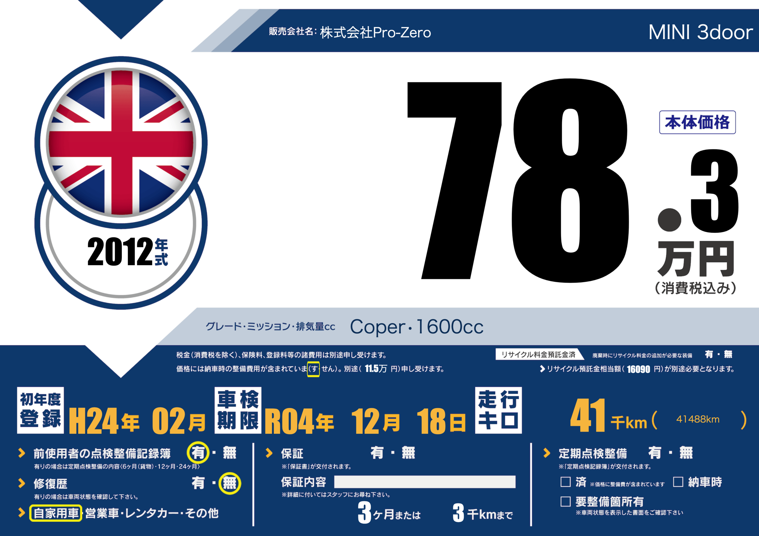 | 車名 | MINI 3door | グレード ミッション 排気量 |