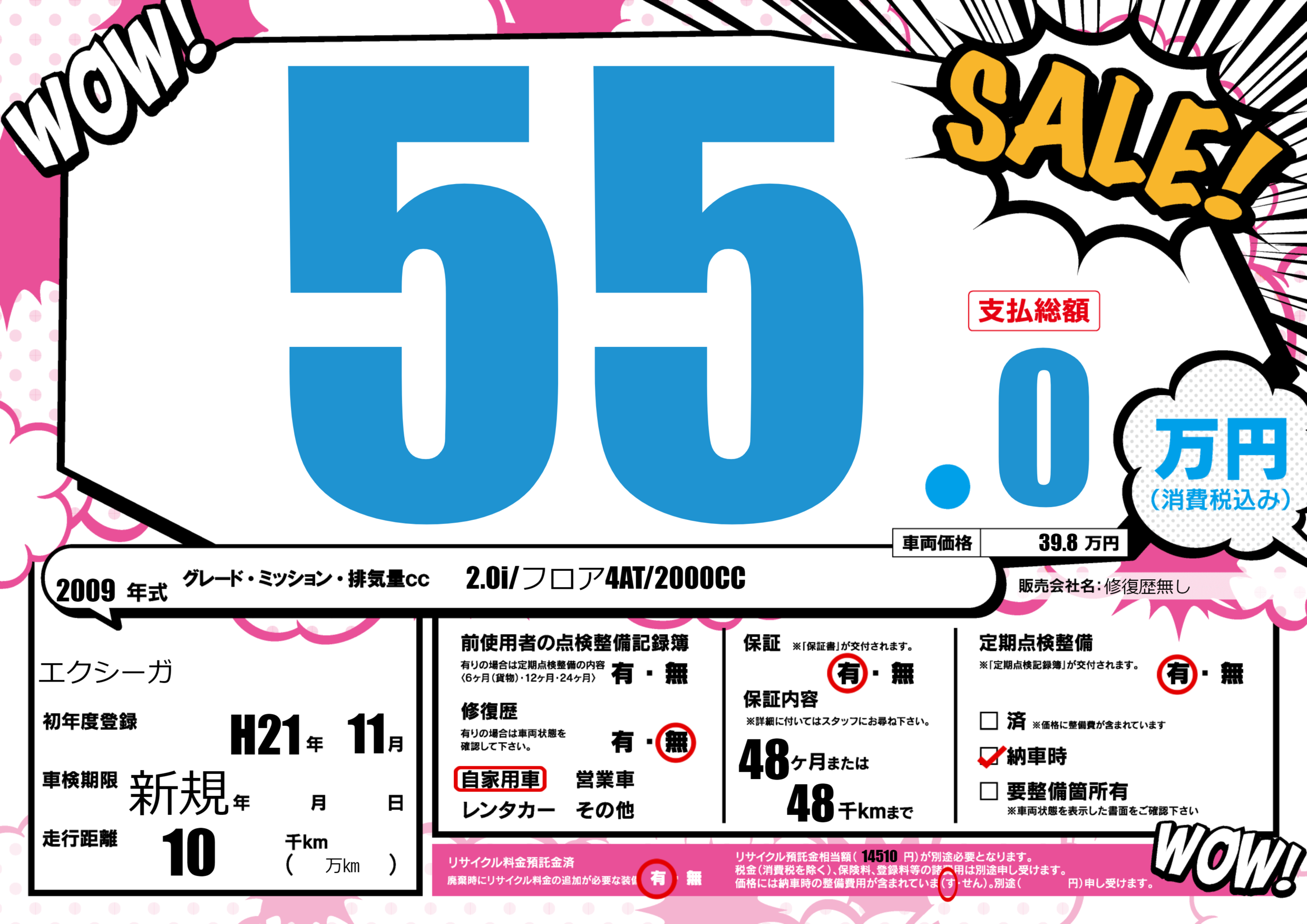 | 車名 | エクシーガ | グレード ミッション 排気量 |