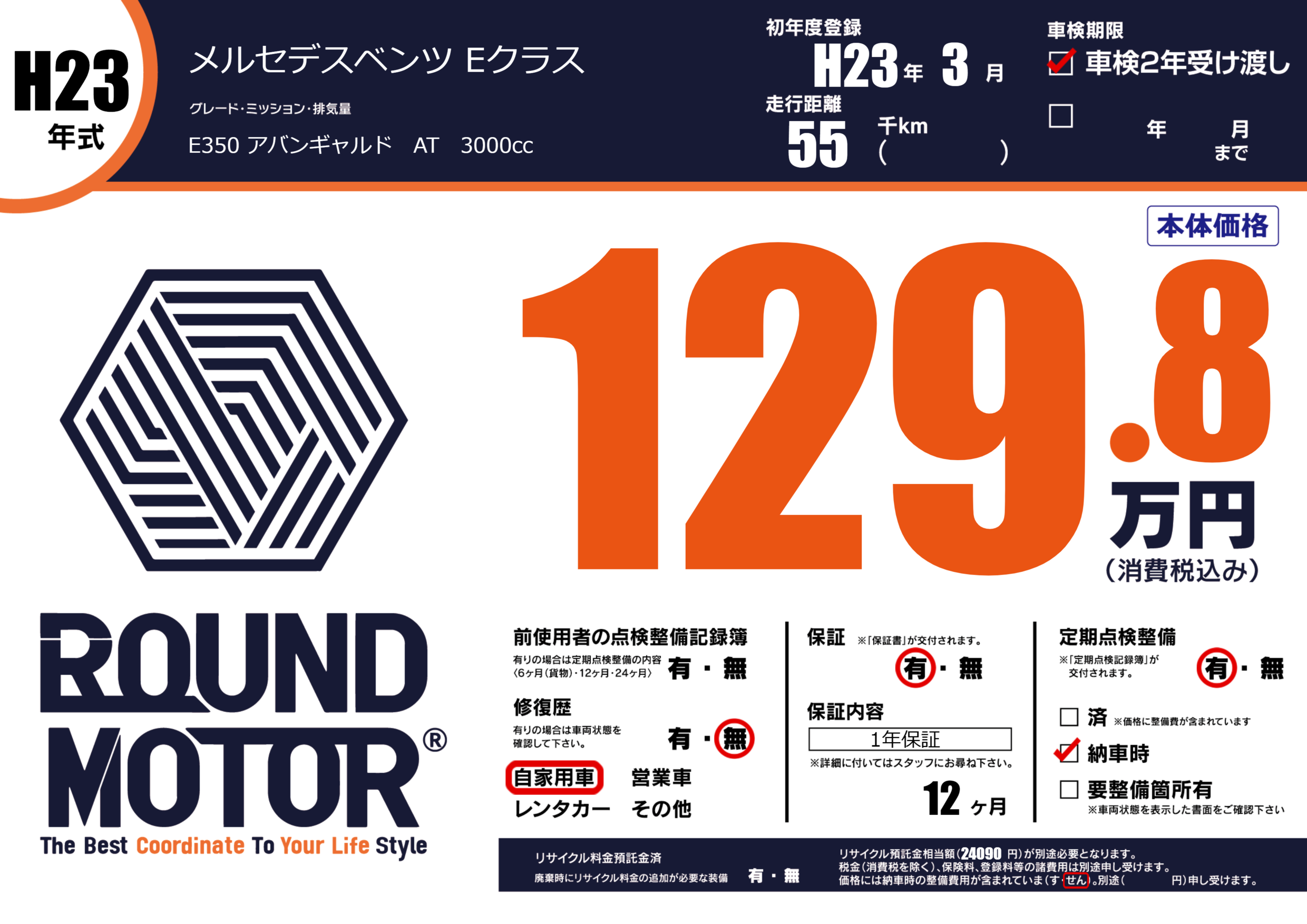 | 車名 | メルセデスベンツ Eクラス | グレード ミッション 排気量 |