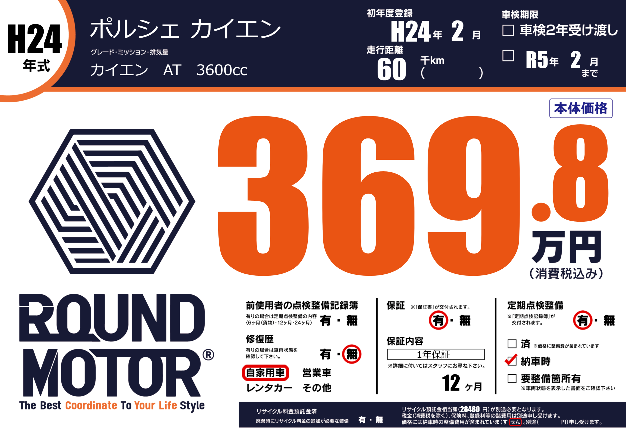 | 車名 | ポルシェ カイエン | グレード ミッション 排気量 |