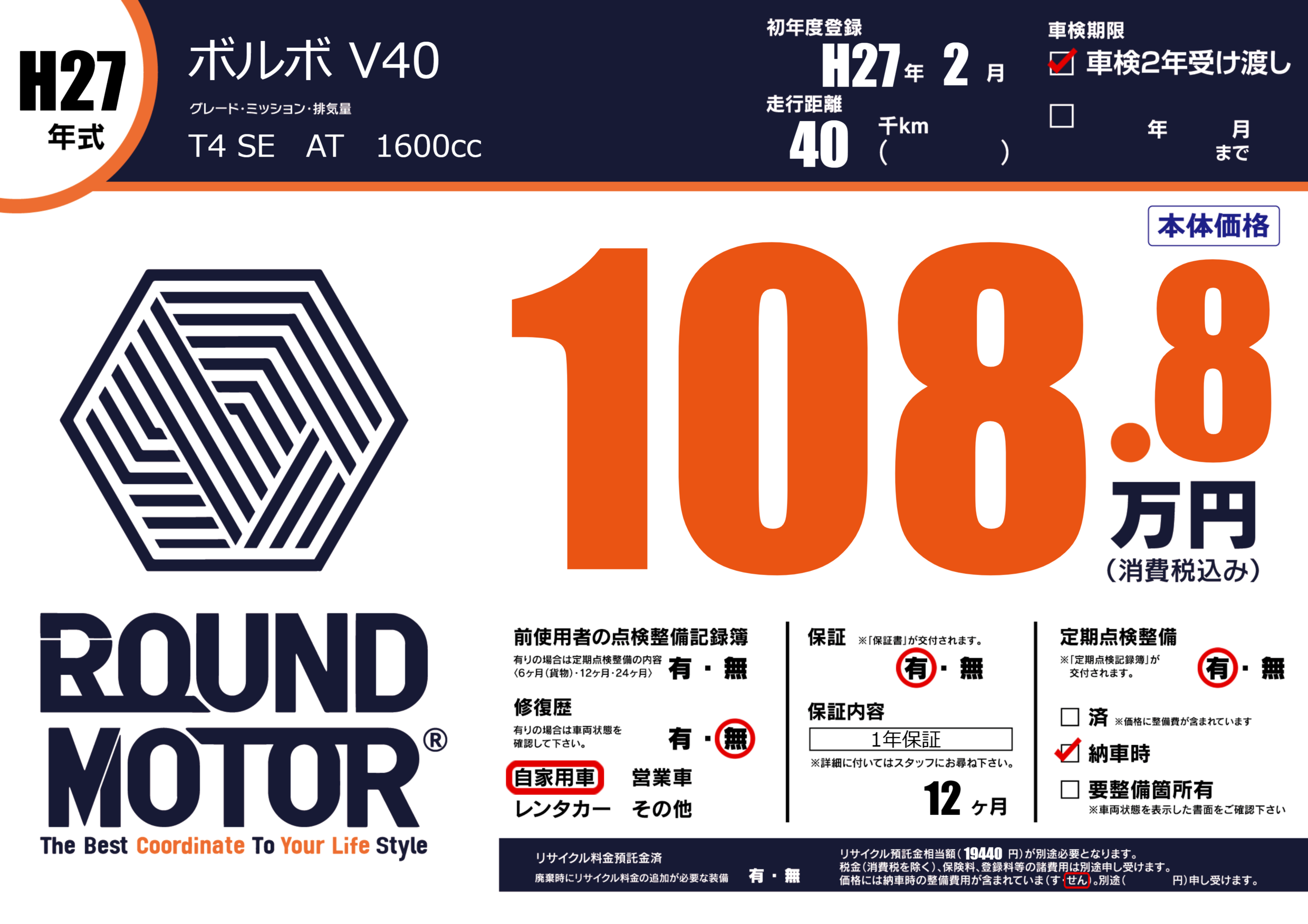 | 車名 | ボルボ V40 | グレード ミッション 排気量 |