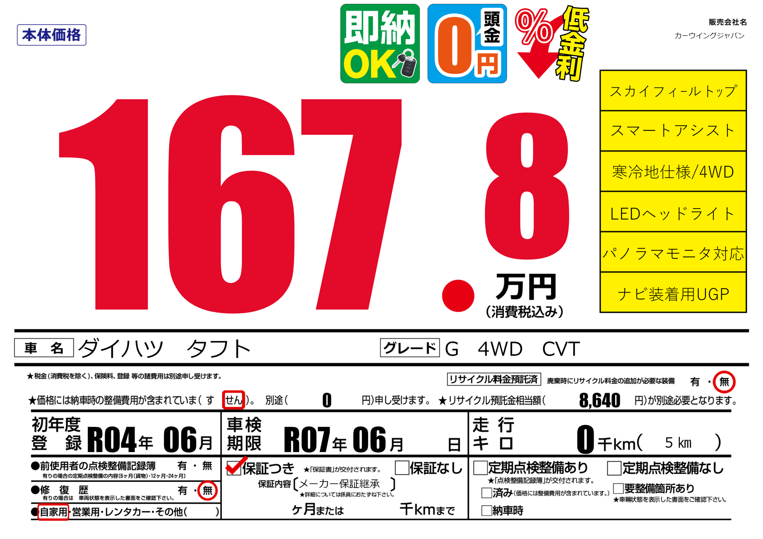 | 車名 | ダイハツ タフト | グレード ミッション 排気量 |