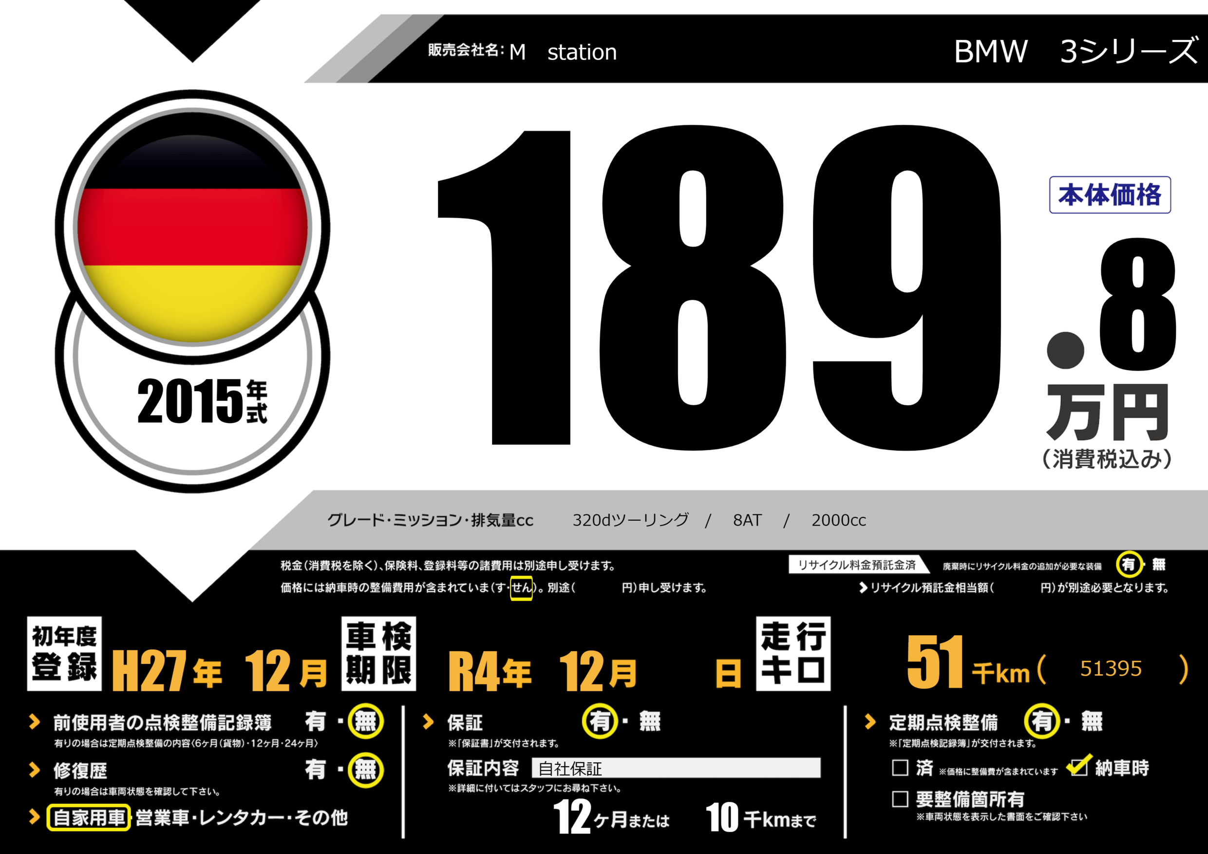 | 車名 | BMW 3シリーズ | グレード ミッション 排気量 |