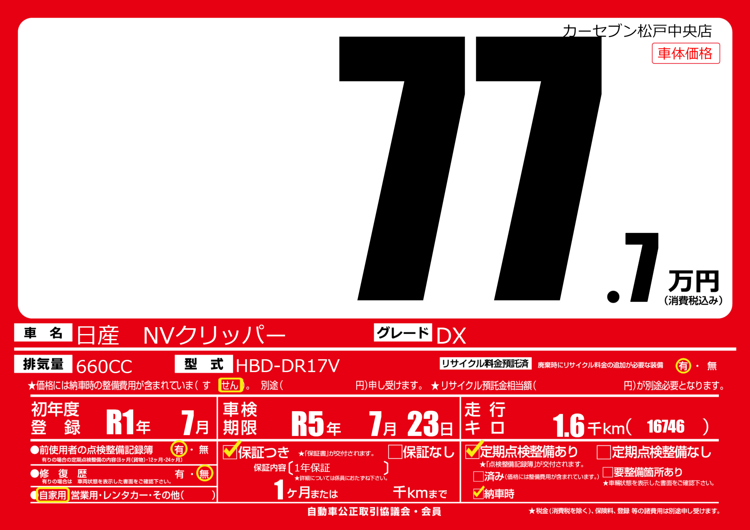 | 車検制限 | R5年 7月 23日 | ||