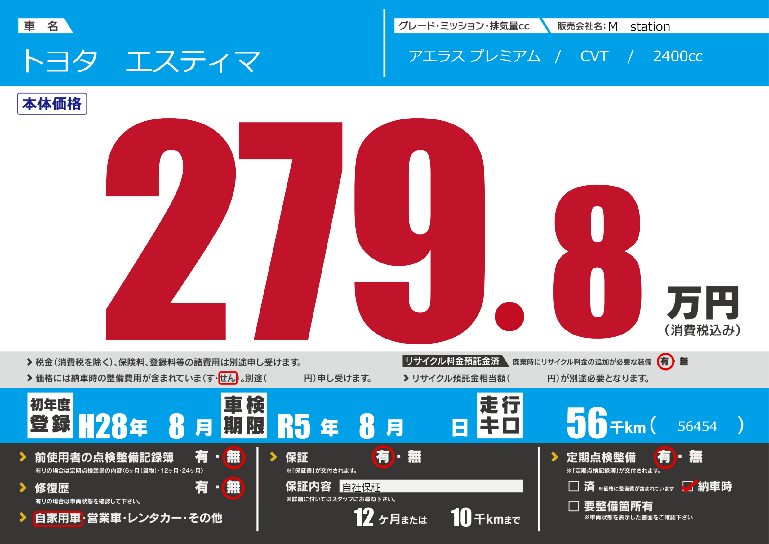 | 車検制限 | R5年 8月 - 日 | ||