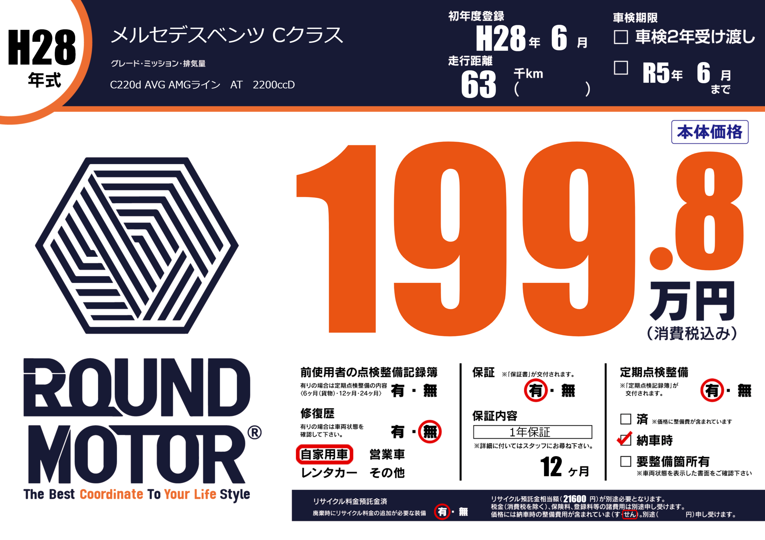 | 車名 | メルセデスベンツ Cクラス | グレード ミッション 排気量 |