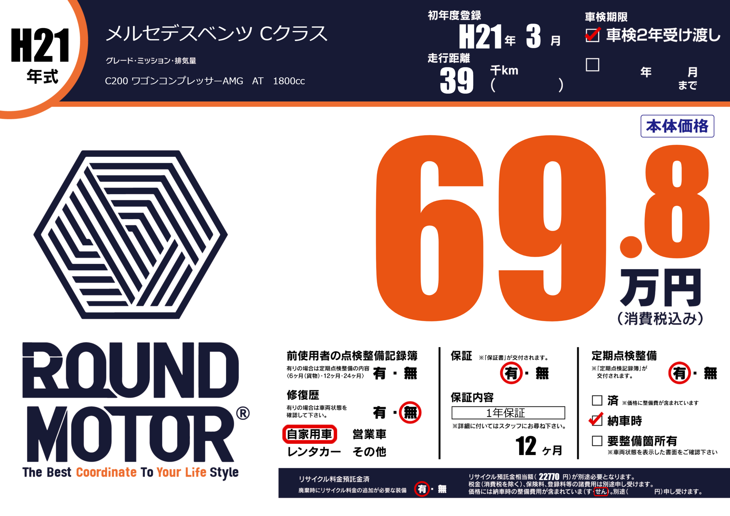 | 車名 | メルセデスベンツ Cクラス | グレード ミッション 排気量 |