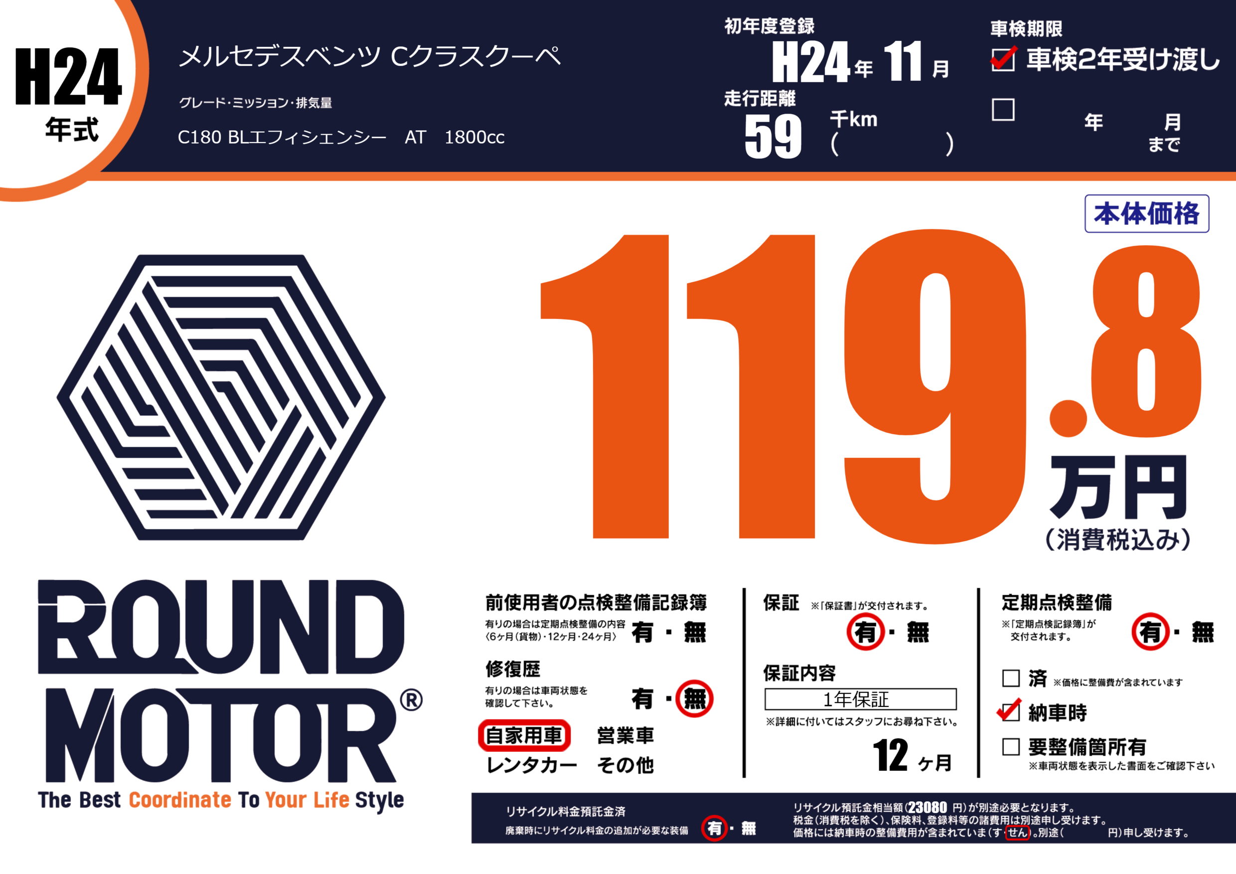 | 車名 | メルセデスベンツ Cクラスクーペ | グレード ミッション 排気量 |