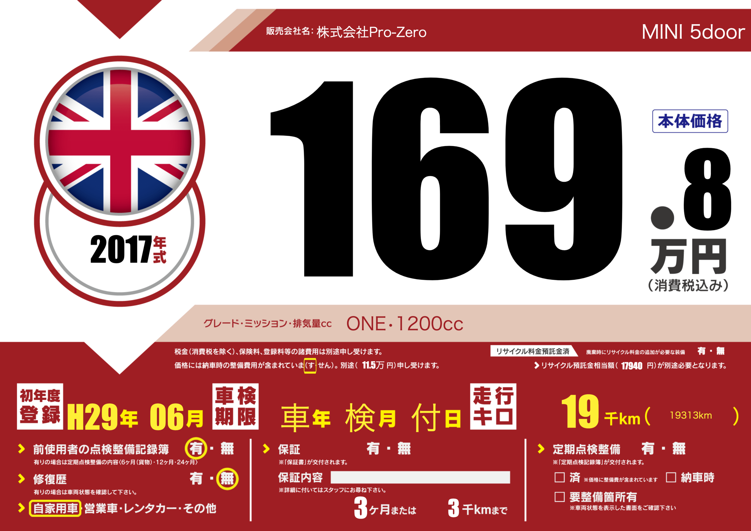 | 車名 | MINI 5door | グレード ミッション 排気量 |