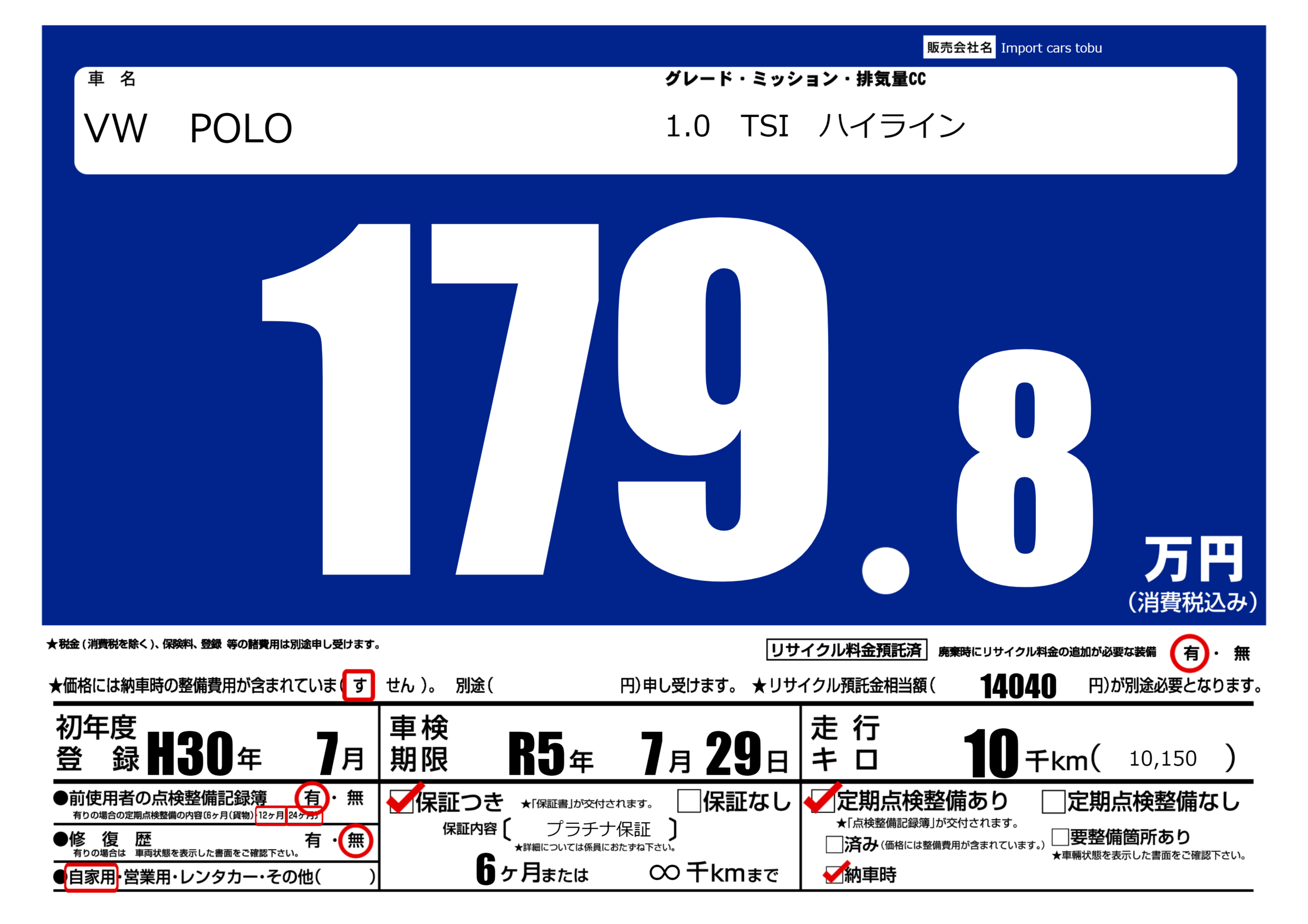 保証付き 保証内容( プラチナ保証) 6ヶ月または(∞)千kmまで |