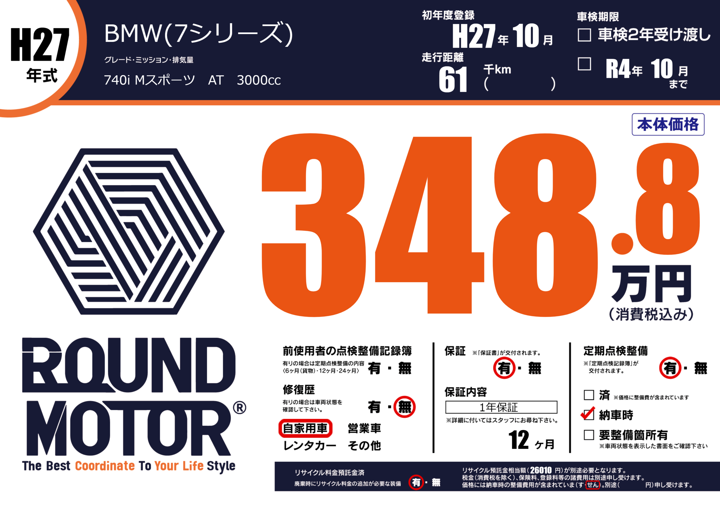 | 車名 | BMW(7シリーズ) | グレード ミッション 排気量 |