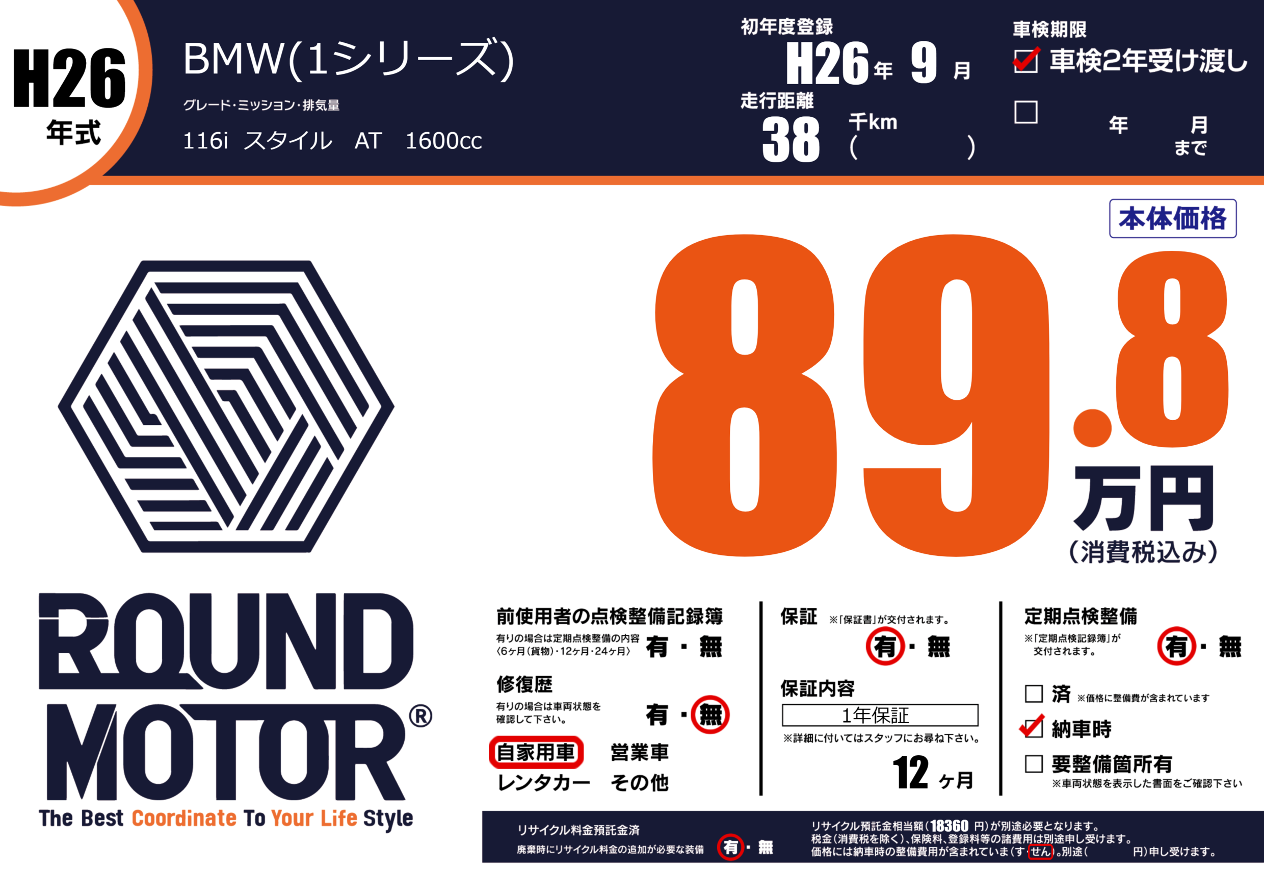 | 走行キロ | 3.8万km | 初年度登録 | H26年9月 |