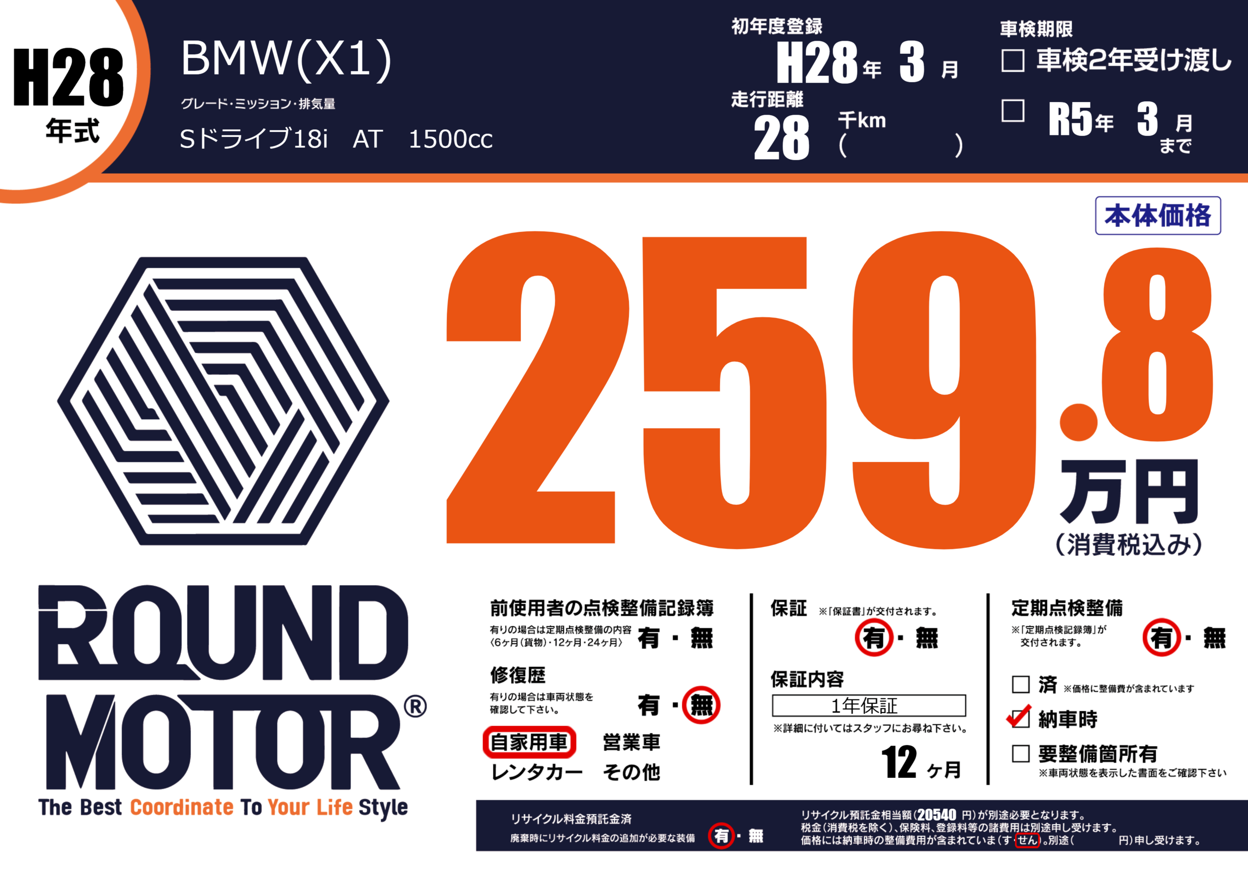 | 車名 | BMW(X1) | グレード ミッション 排気量 |