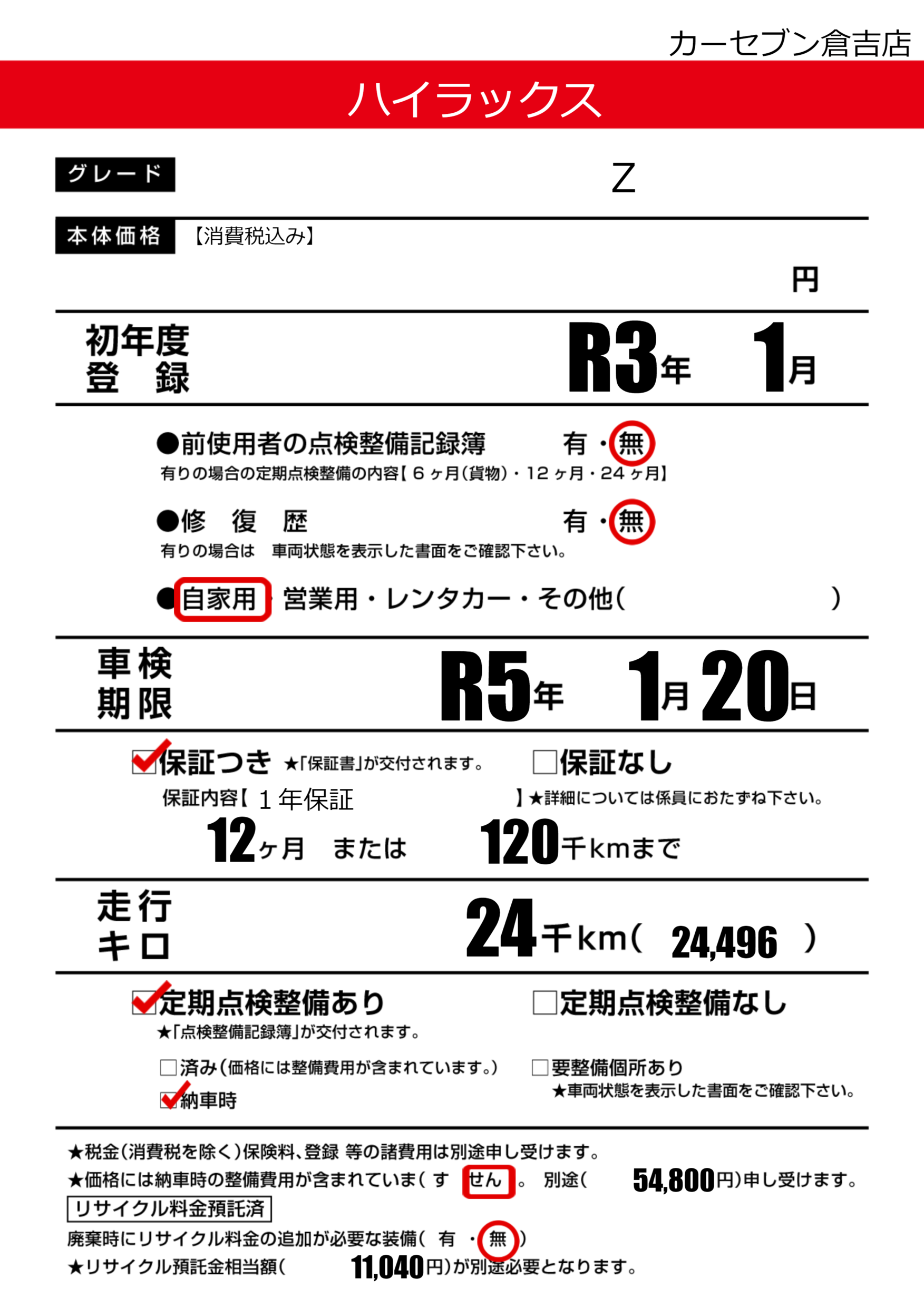 | 走行キロ | 2.4万km | 初年度登録 | R3年1月 |