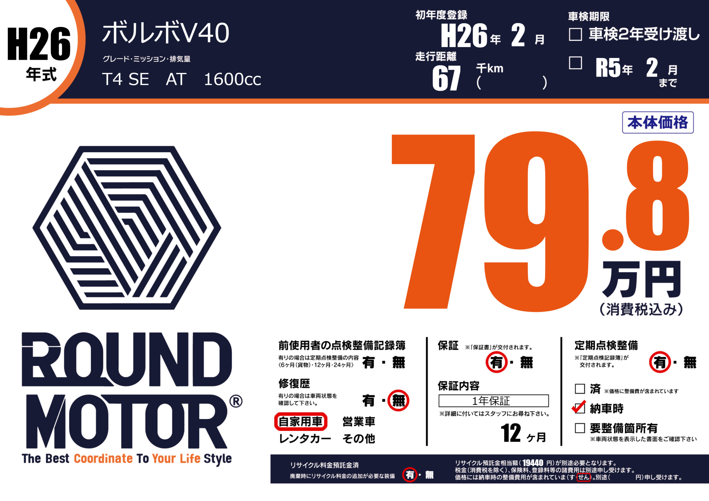| 車名 | ボルボV40 | グレード ミッション 排気量 |