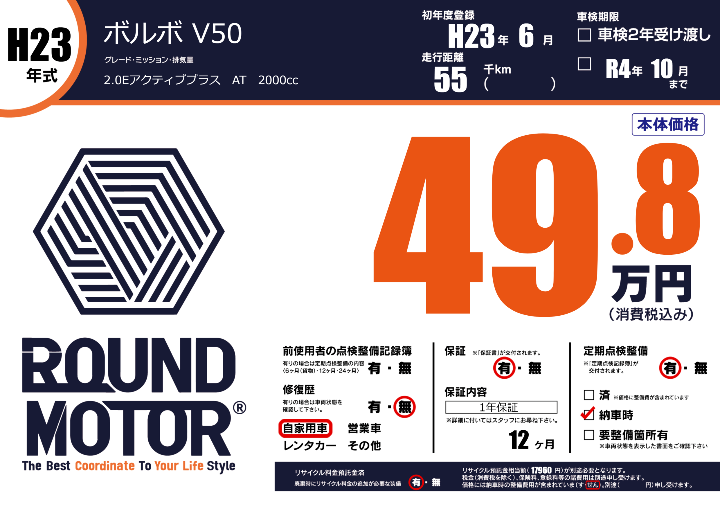| 車名 | ボルボ V50 | グレード ミッション 排気量 |