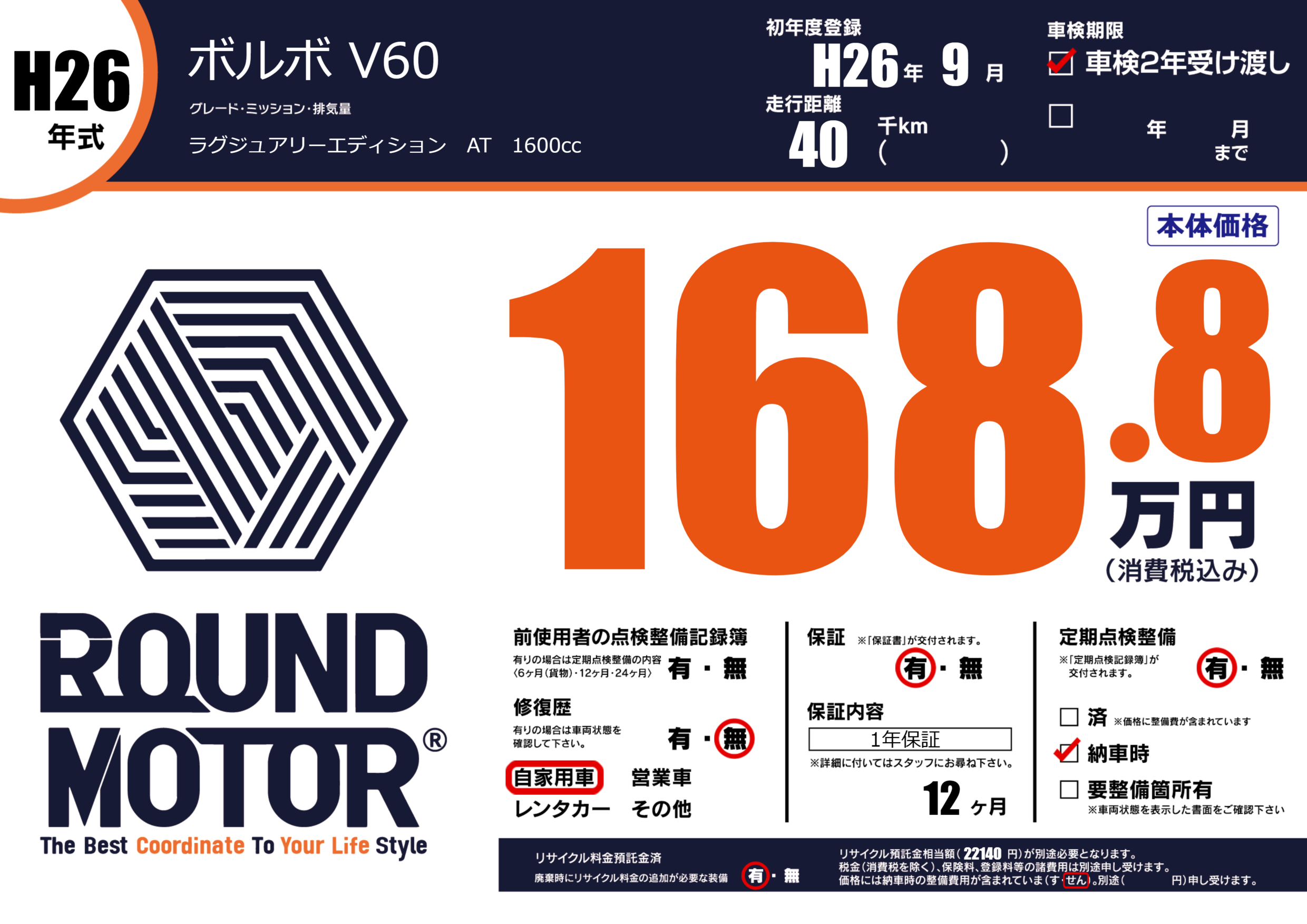 保証付き 保証内容(1年保証) 12ヶ月または()千kmまで |