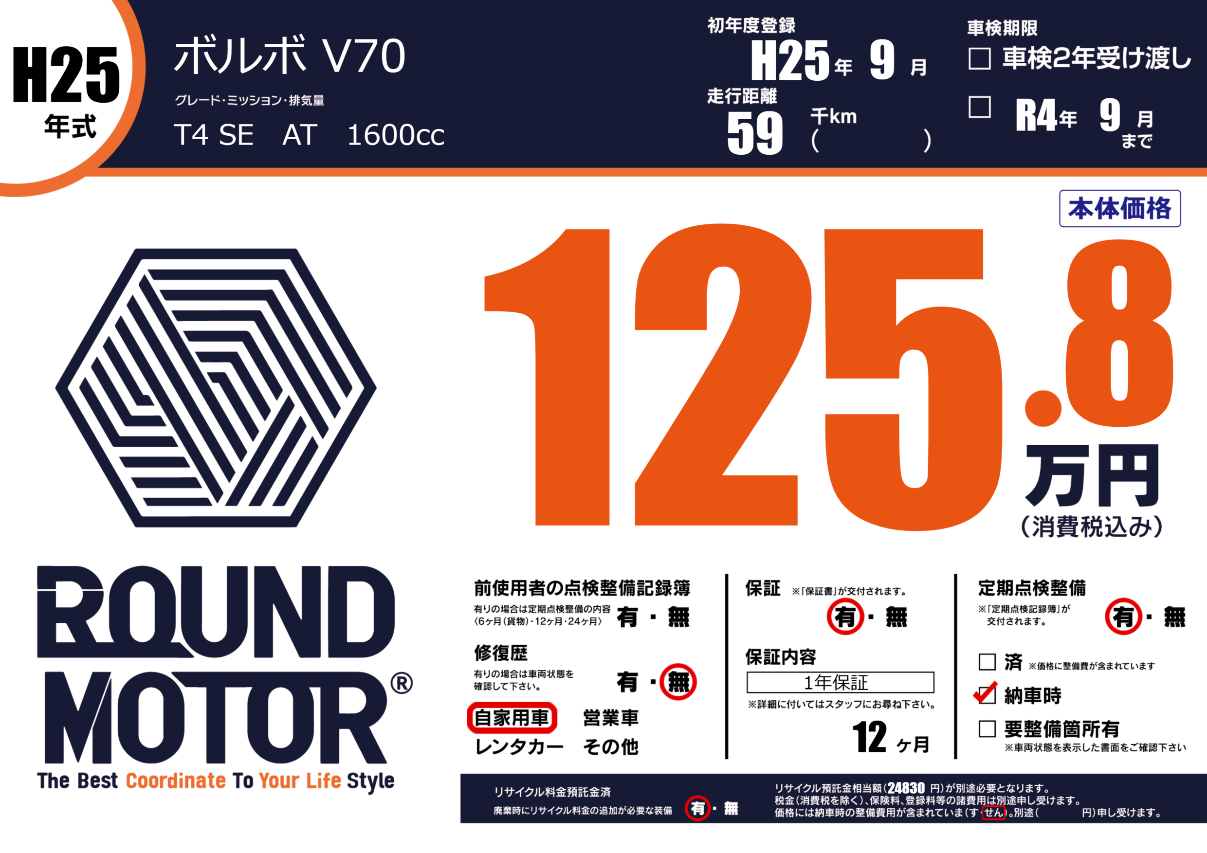 | 車名 | ボルボ V70 | グレード ミッション 排気量 |