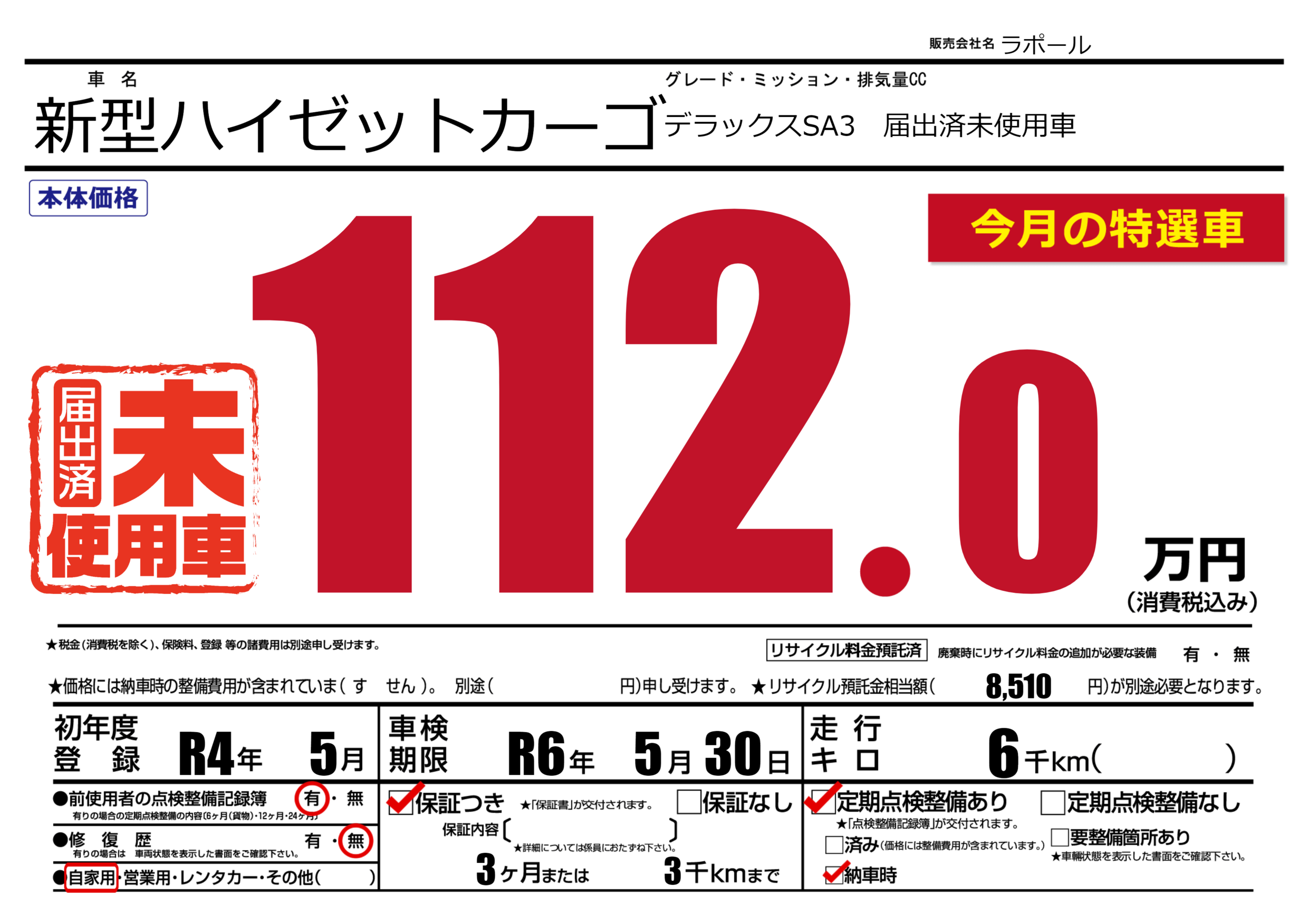 | 車名 | 新型ハイゼットカーゴ | グレード ミッション 排気量 |