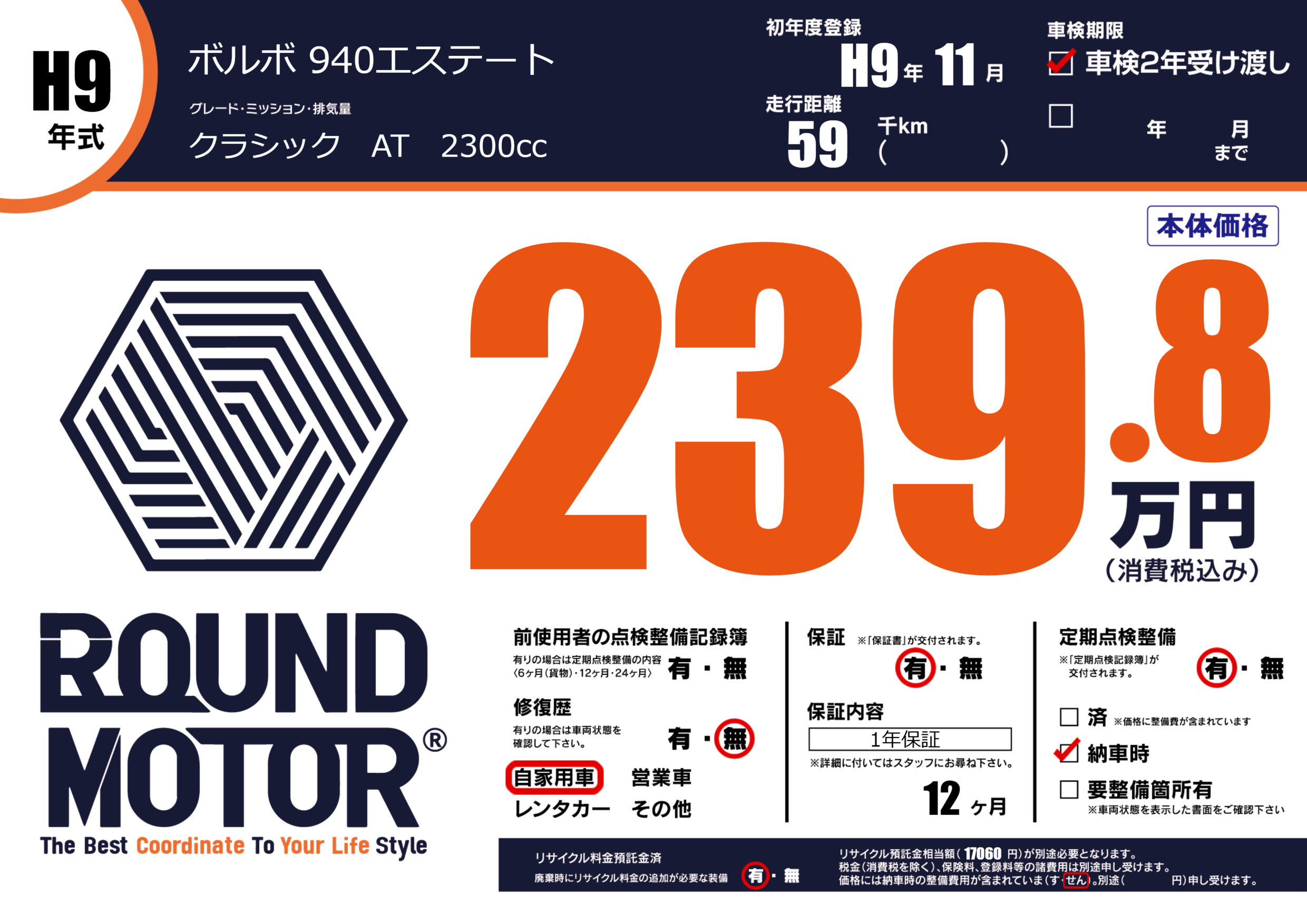 | 車名 | ボルボ 940エステート | グレード ミッション 排気量 |