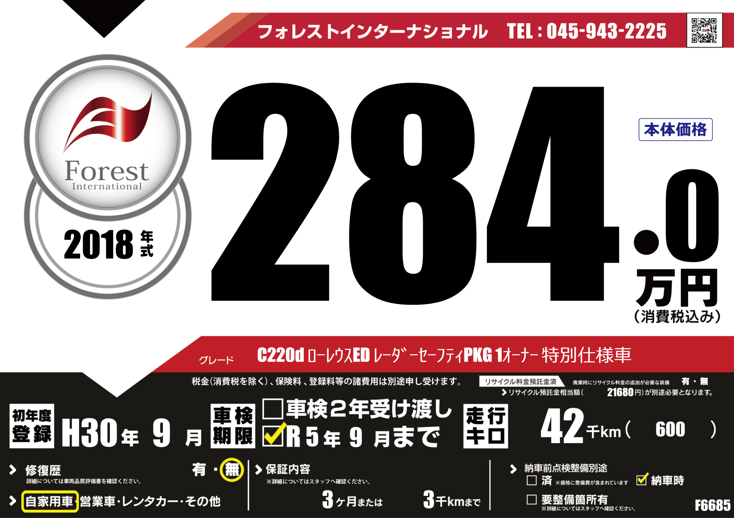 | 走行キロ | 4.2万km | 初年度登録 | H30年9月 |