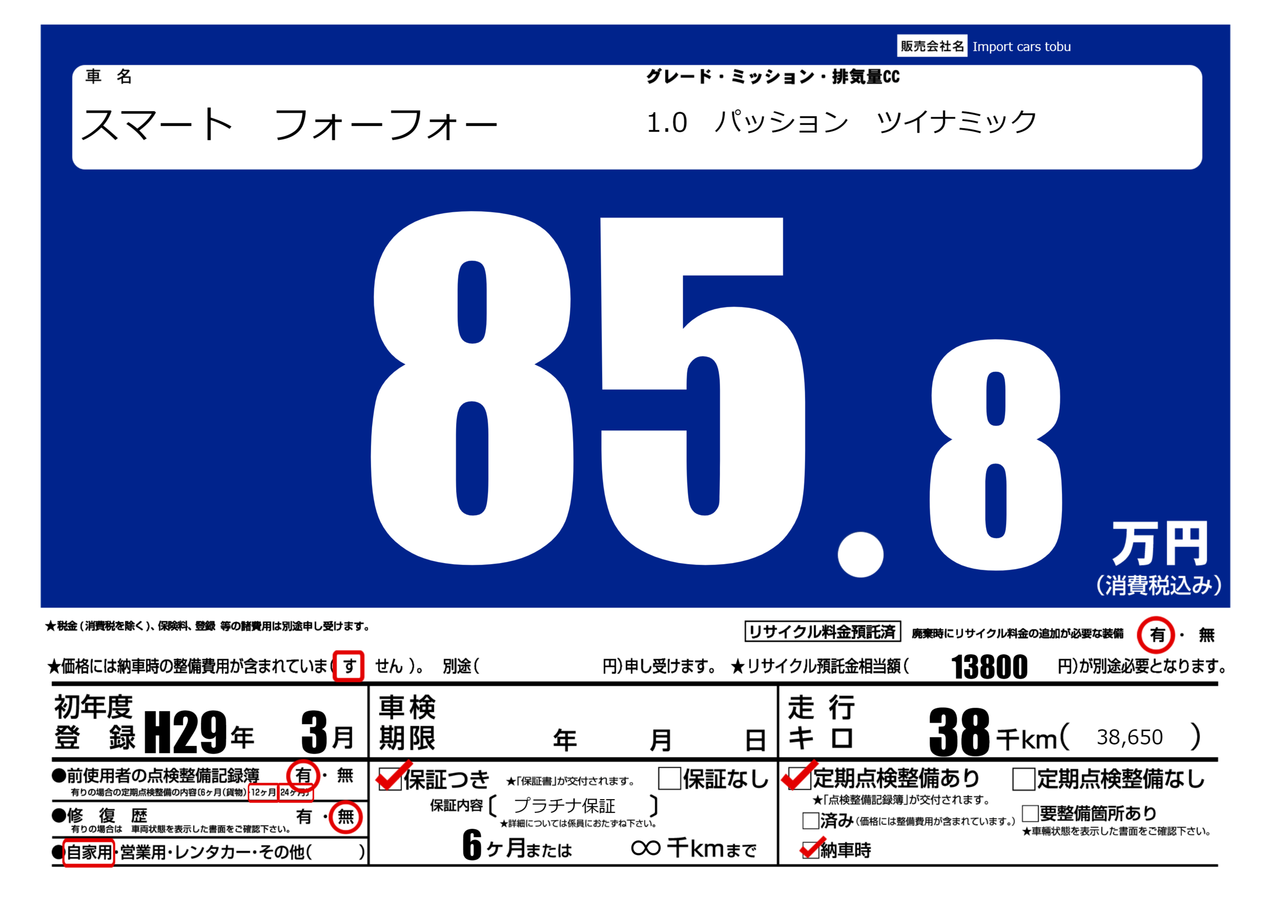 保証付き 保証内容( プラチナ保証) 6ヶ月または(∞)千kmまで |