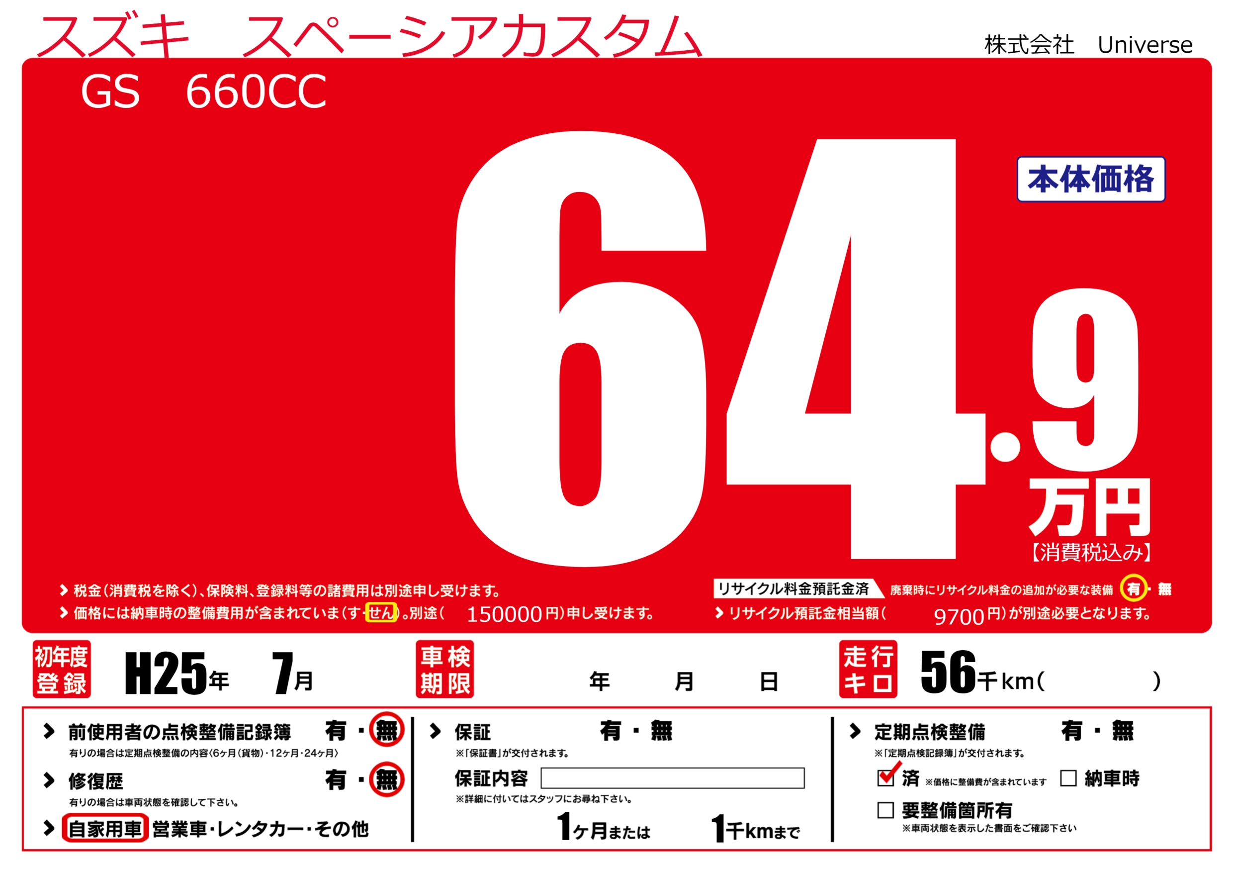 | 定期点検整備 | 定期点検整備済み | ||