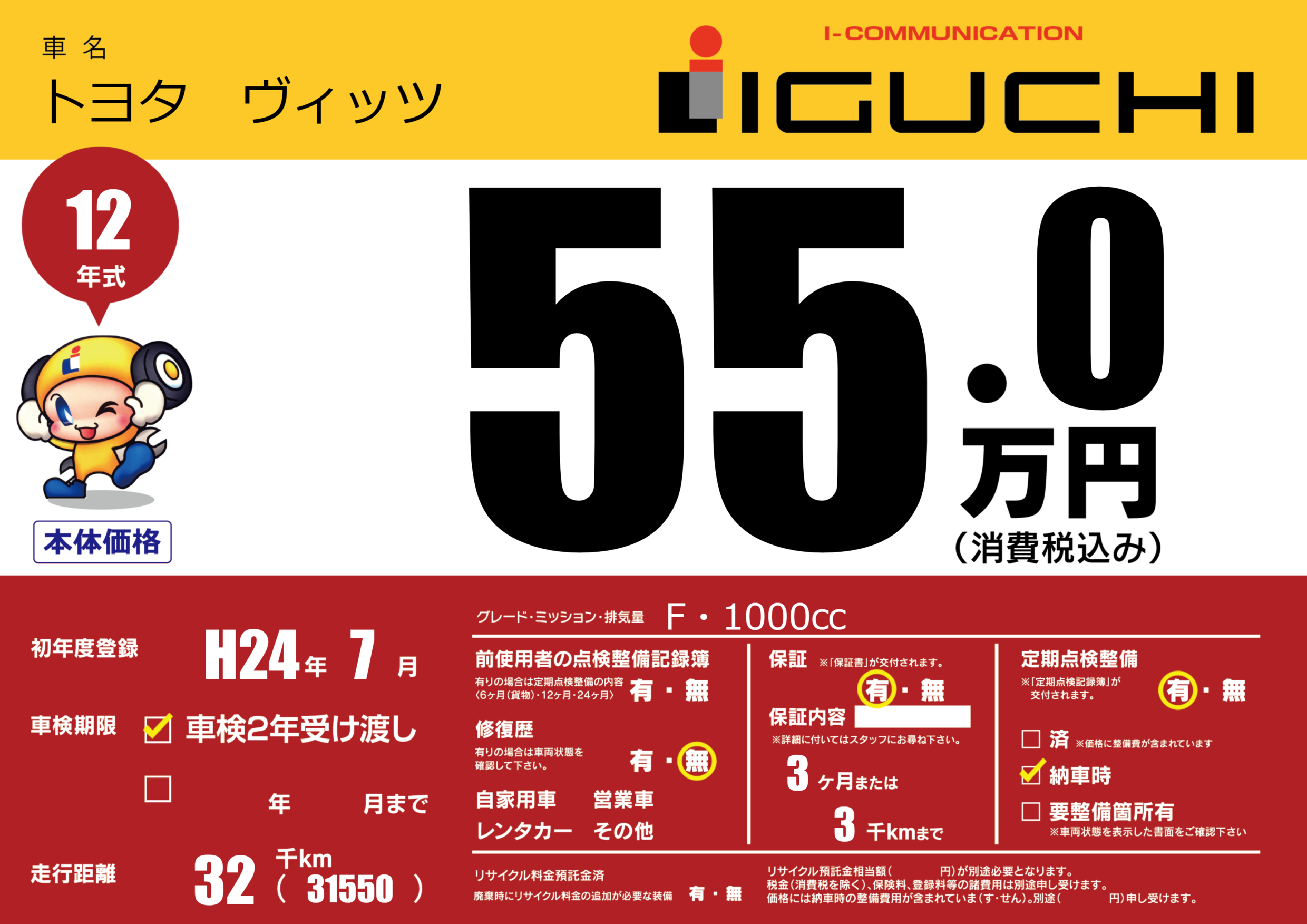 | 車名 | トヨタ ヴィッツ | グレード ミッション 排気量 |