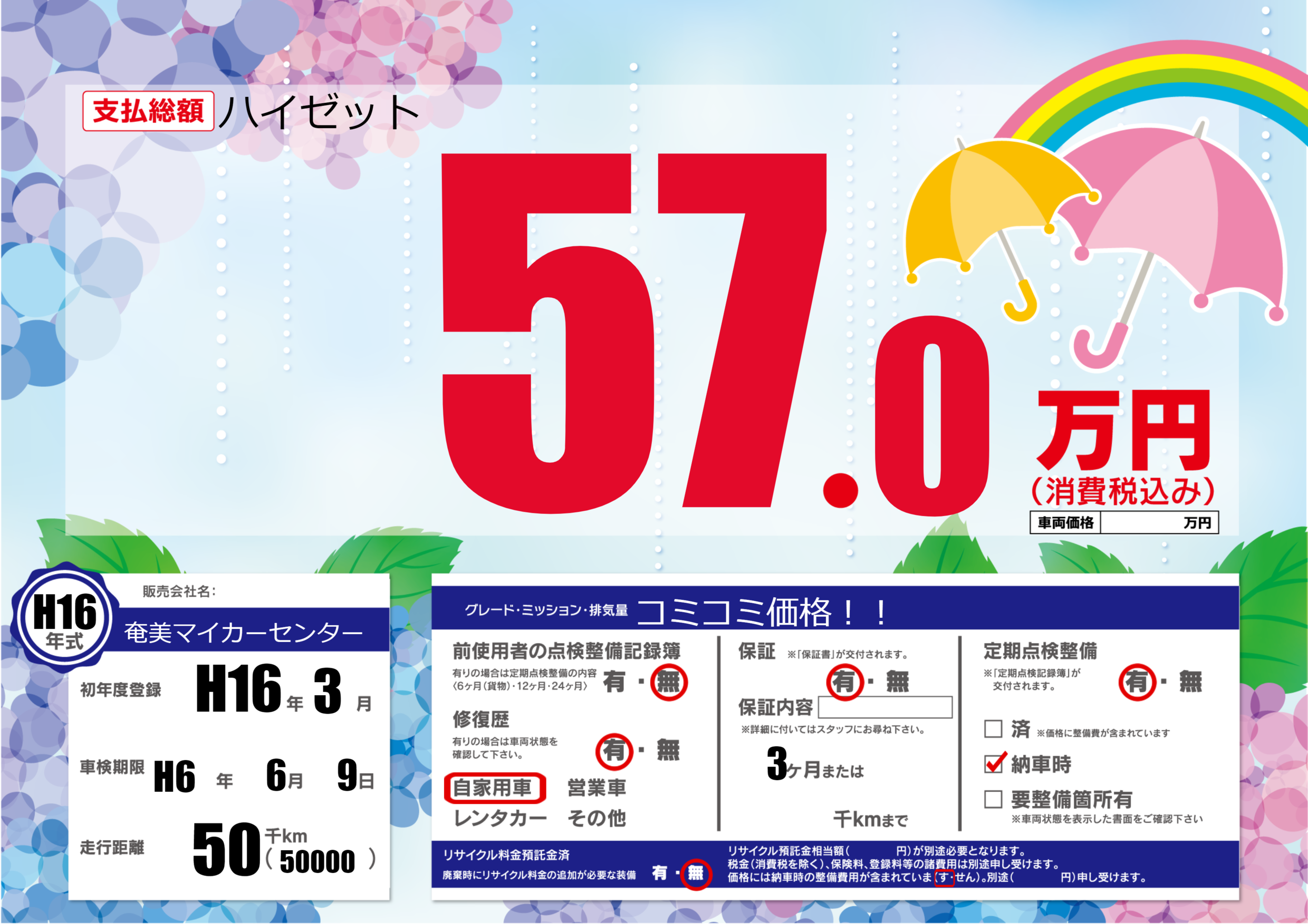 | 走行キロ | 5万km | 初年度登録 | H16年3月 |